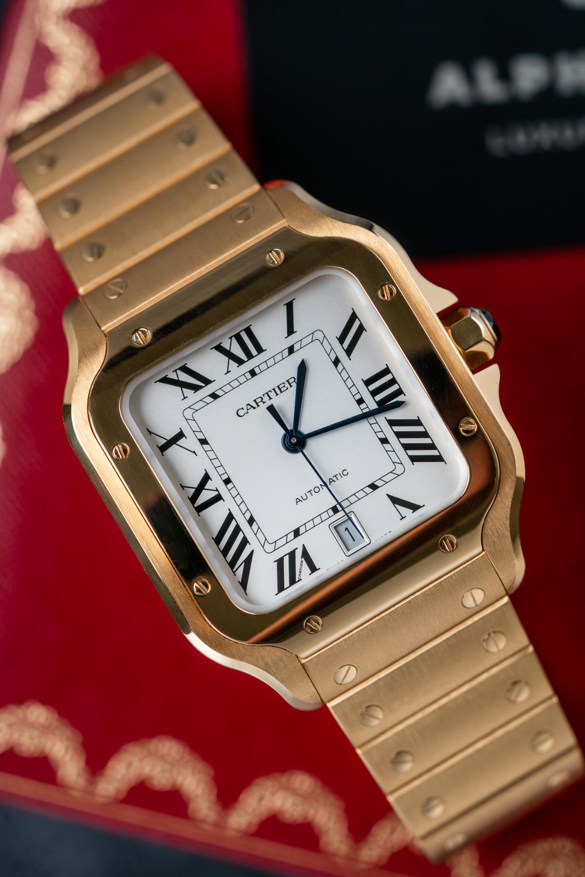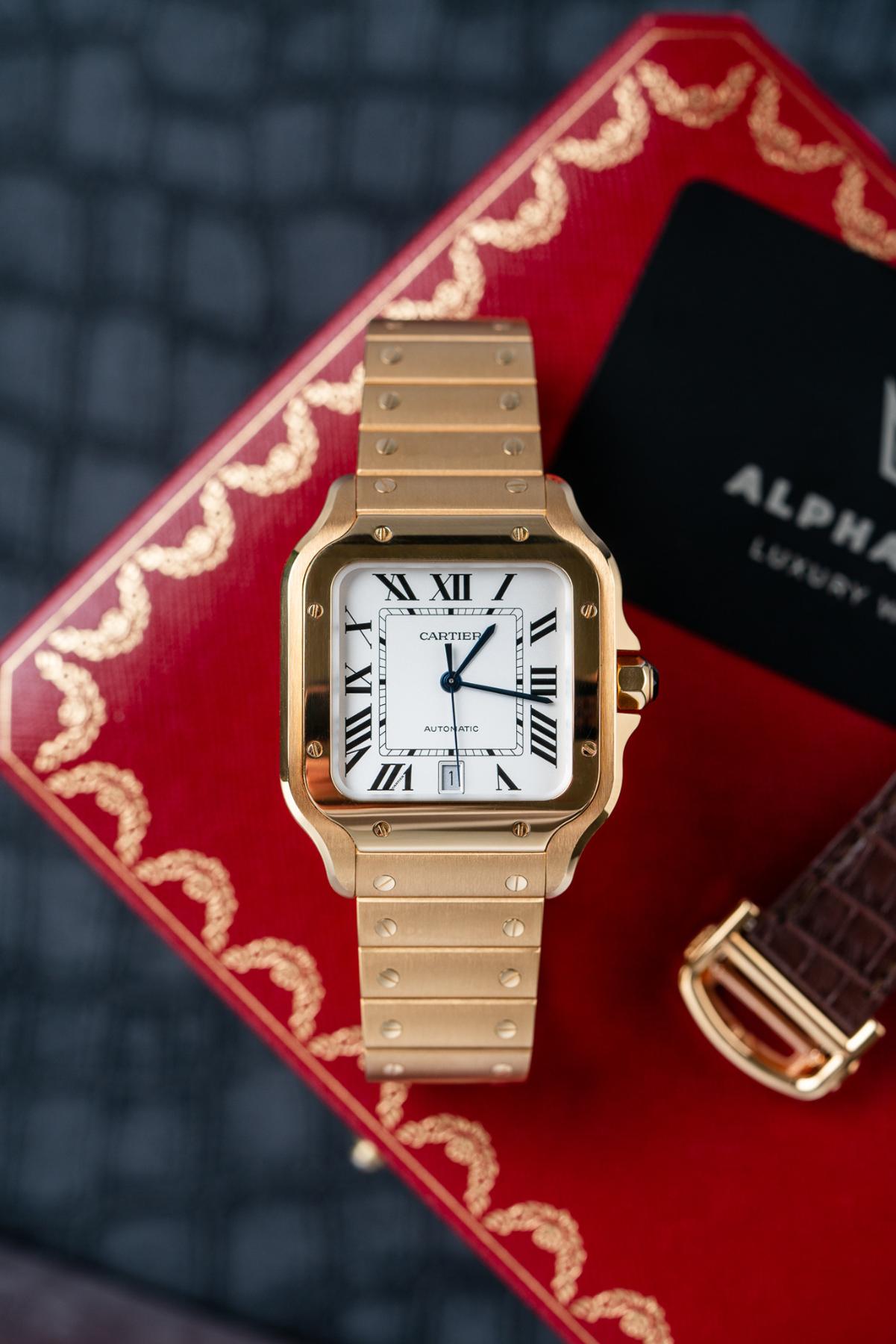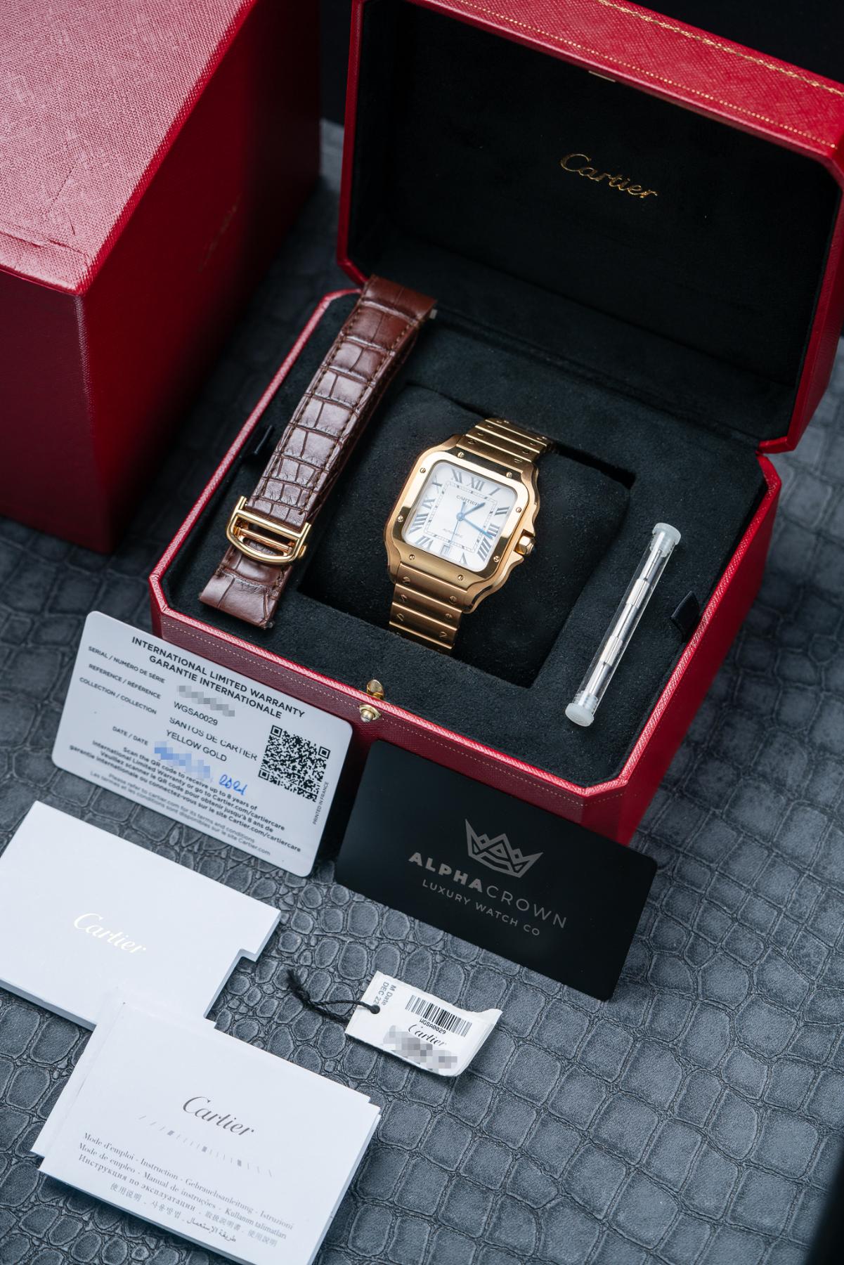 The Cartier Santos de Cartier Ref. WGSA0029 is a sophisticated yellow gold large-model timepiece combining luxurious design and modern functionality. Encased in 18k gold with a 39.8 mm case and ~9.38 mm thickness, the watch features a silvered opaline dial with Roman numerals and blued-steel sword hands. Powered by Cartier’s Calibre 1847 MC automatic movement, it delivers a 42-hour power reserve. It is water-resistant to 10 bar (100 m) and offers interchangeable styling via the QuickSwitch system, including both a gold bracelet (with SmartLink adjustment) and an alligator leather strap. Elegant and versatile, the WGSA0029 captures Cartier’s heritage and innovation in a striking, full-gold package.