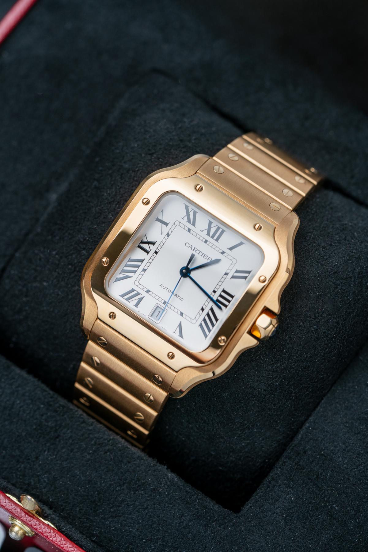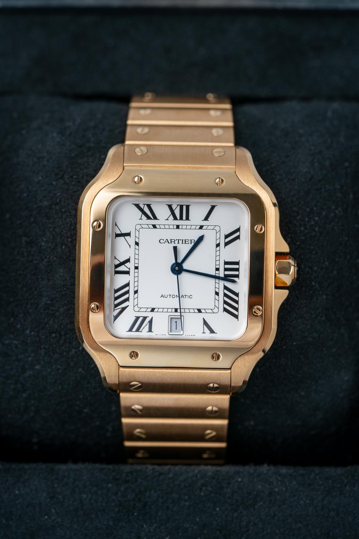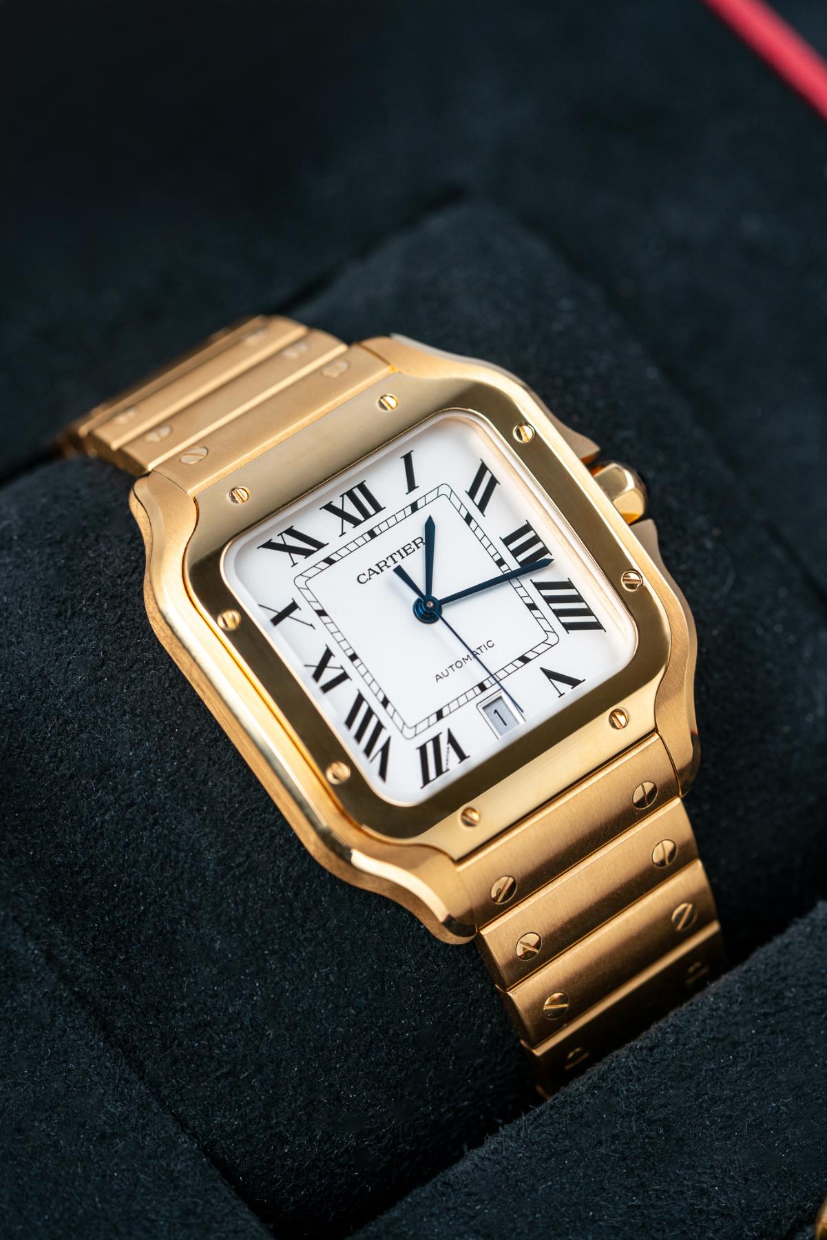 The Cartier Santos de Cartier Ref. WGSA0029 is a sophisticated yellow gold large-model timepiece combining luxurious design and modern functionality. Encased in 18k gold with a 39.8 mm case and ~9.38 mm thickness, the watch features a silvered opaline dial with Roman numerals and blued-steel sword hands. Powered by Cartier’s Calibre 1847 MC automatic movement, it delivers a 42-hour power reserve. It is water-resistant to 10 bar (100 m) and offers interchangeable styling via the QuickSwitch system, including both a gold bracelet (with SmartLink adjustment) and an alligator leather strap. Elegant and versatile, the WGSA0029 captures Cartier’s heritage and innovation in a striking, full-gold package.