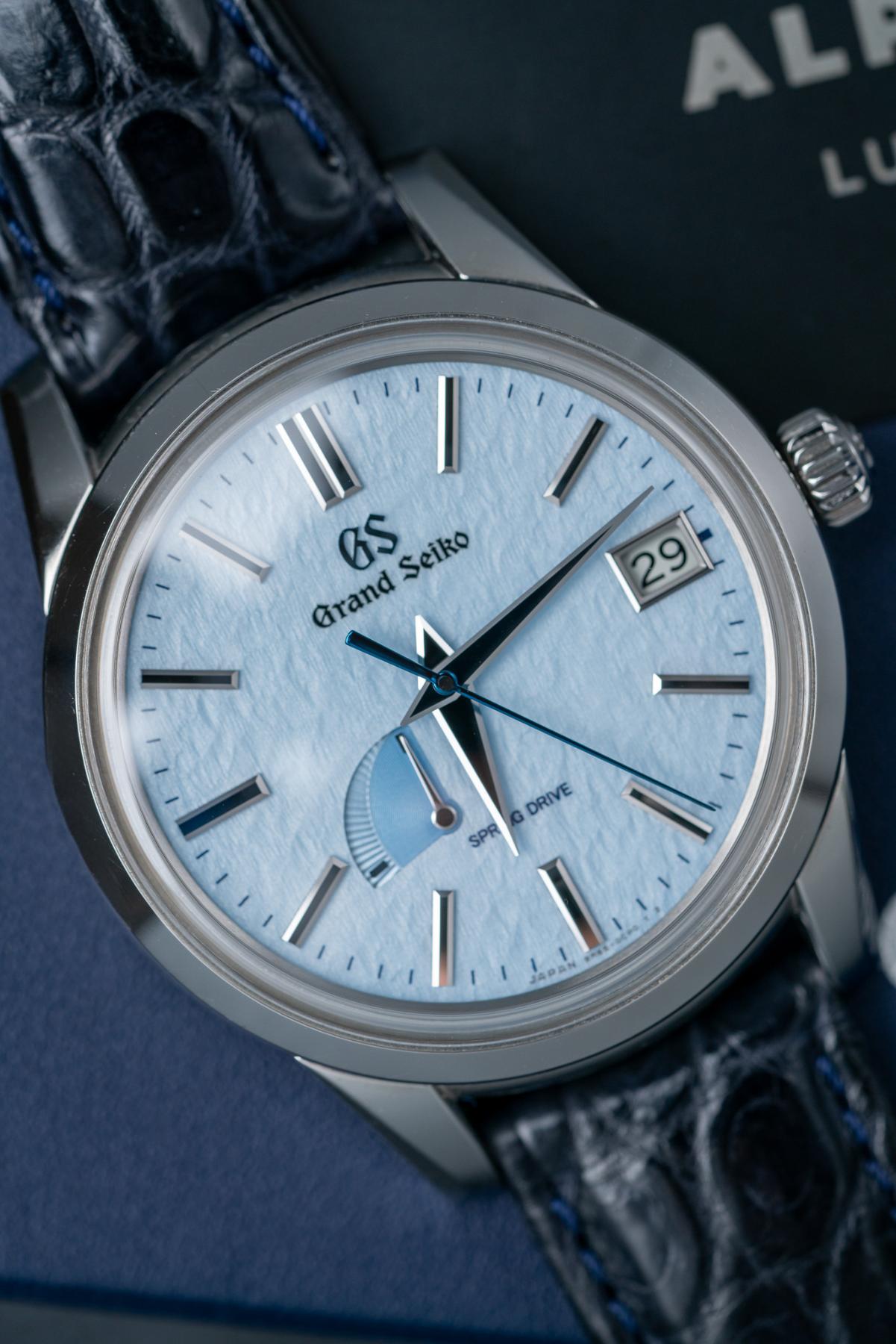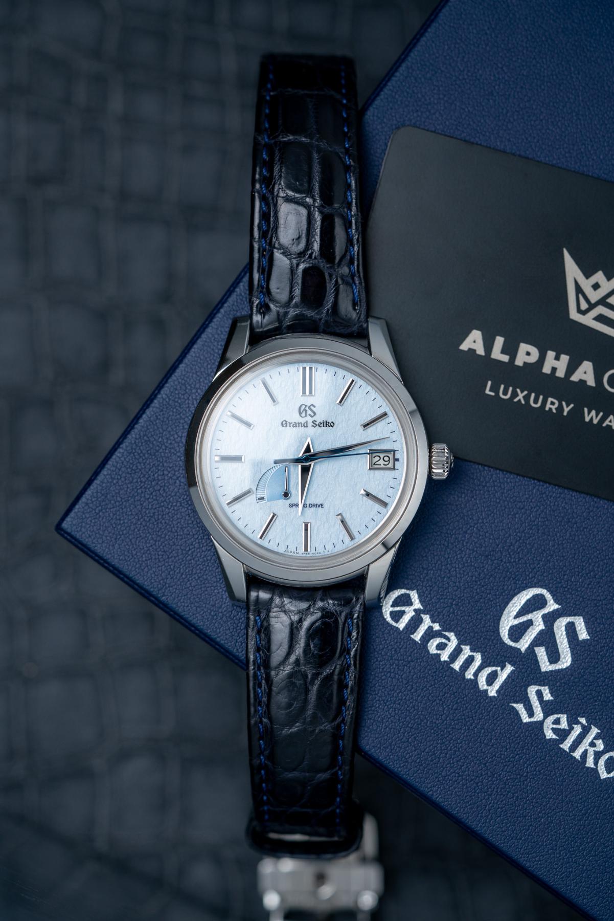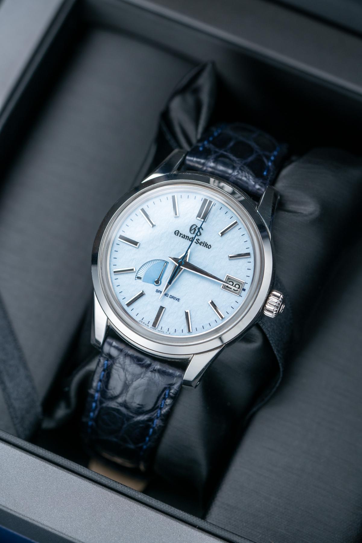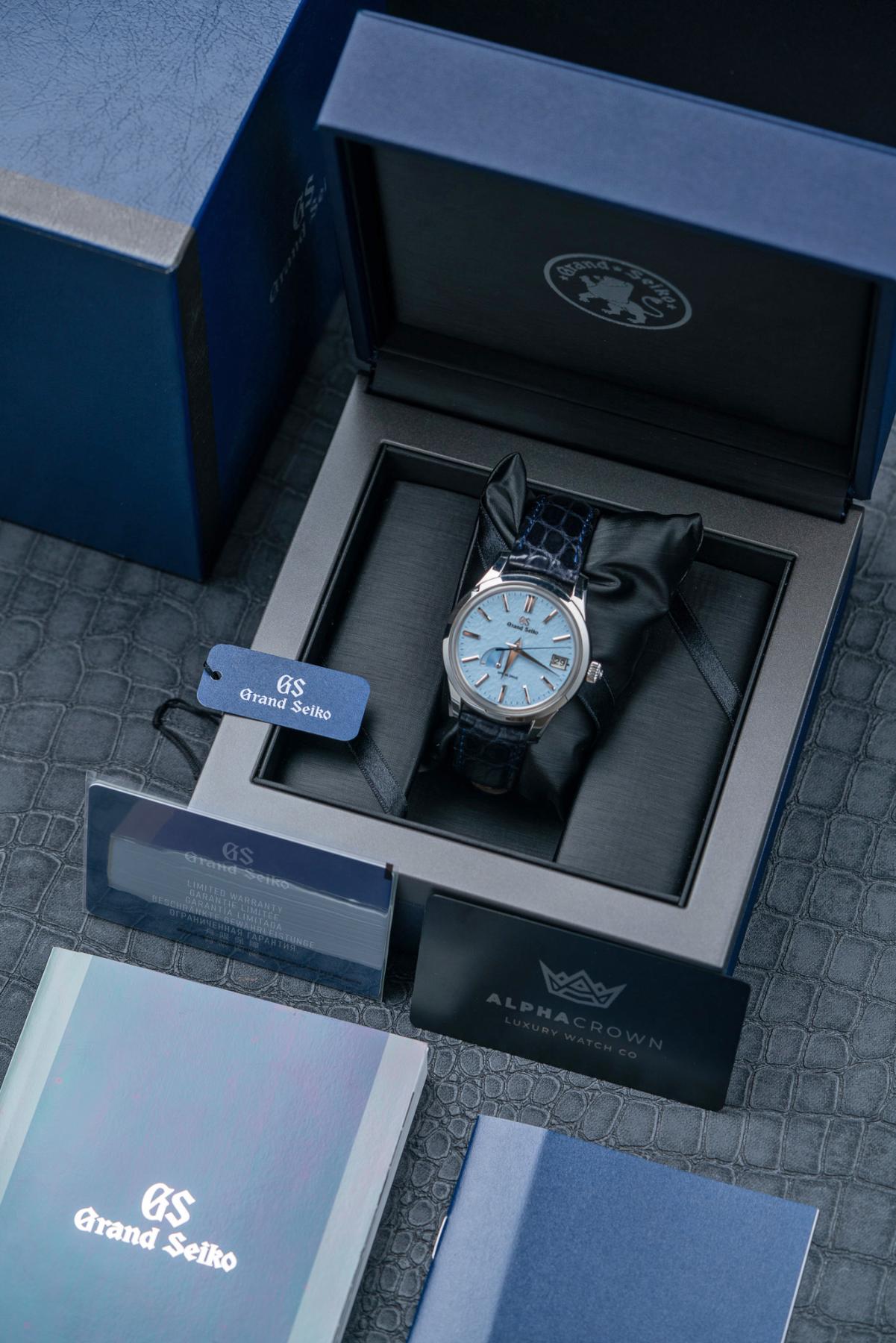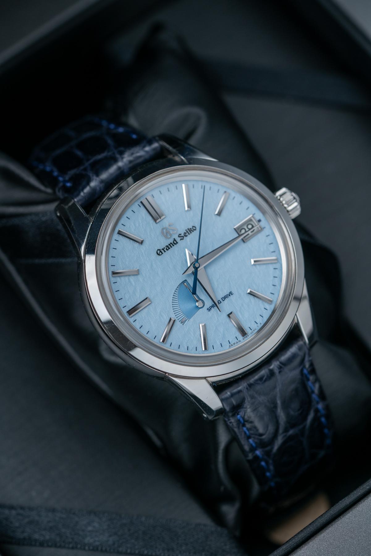 The Grand Seiko SBGA407G “Blue Snowflake” is a 40.2 mm stainless steel timepiece powered by the Spring Drive Caliber 9R65, offering a 72-hour power reserve and ±1 second per day accuracy. Its textured pale blue dial, inspired by Shinshu snow, features a blued steel second hand, date display, and power reserve indicator. Protected by sapphire crystal with 100 m water resistance, the watch is paired with a crocodile leather strap. Combining artisanal finishing with Spring Drive innovation, the SBGA407G is a signature Grand Seiko blending elegance and precision.
