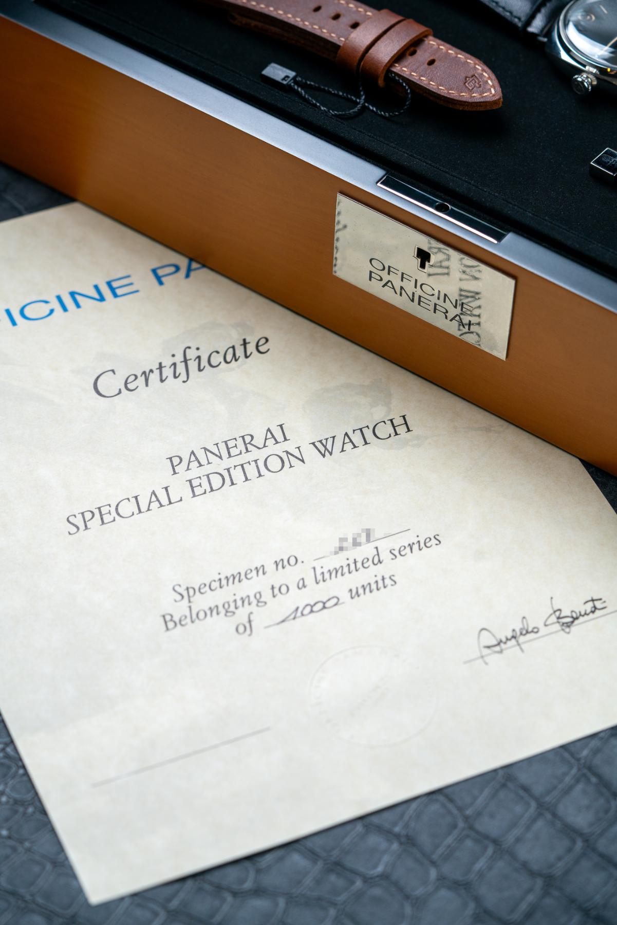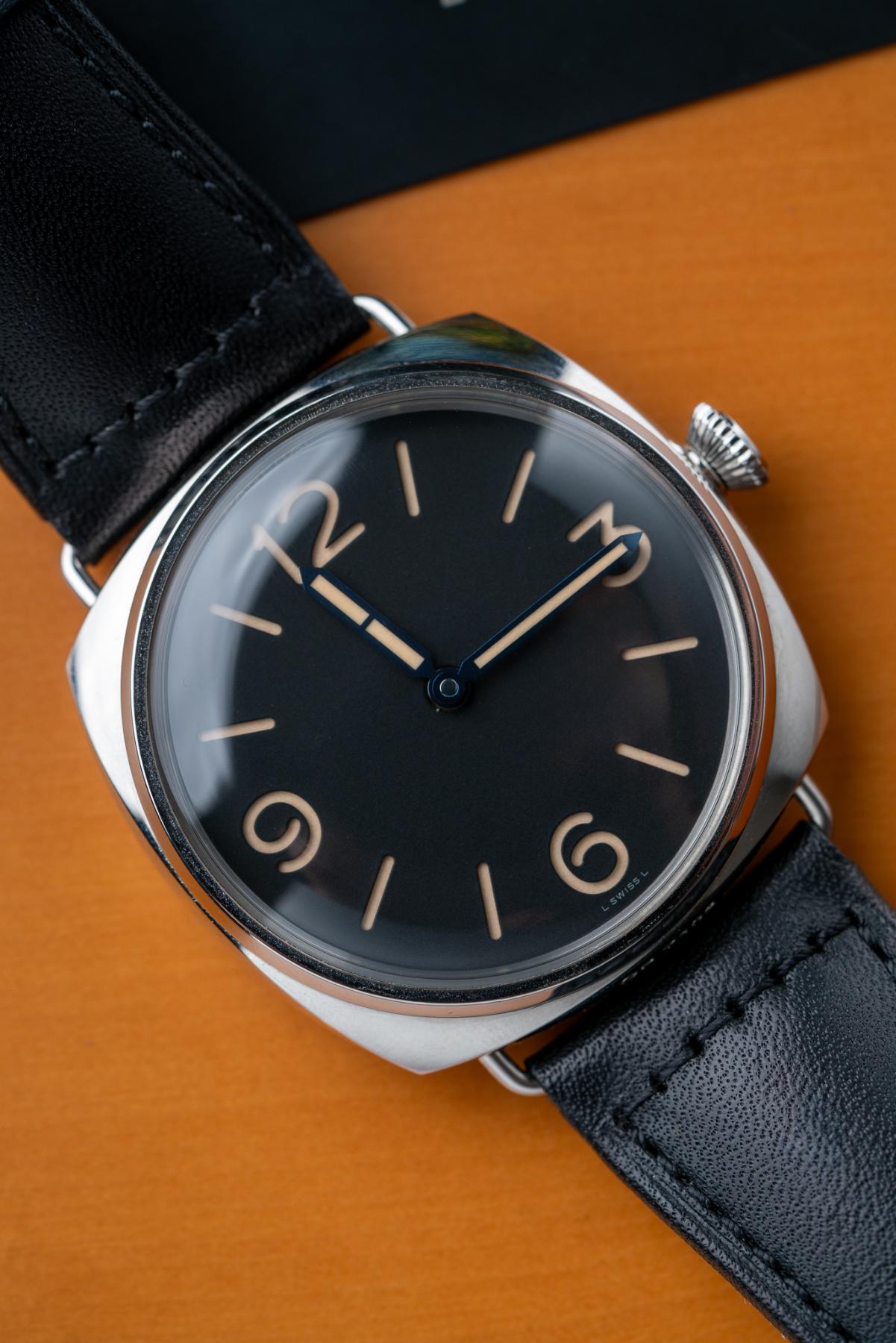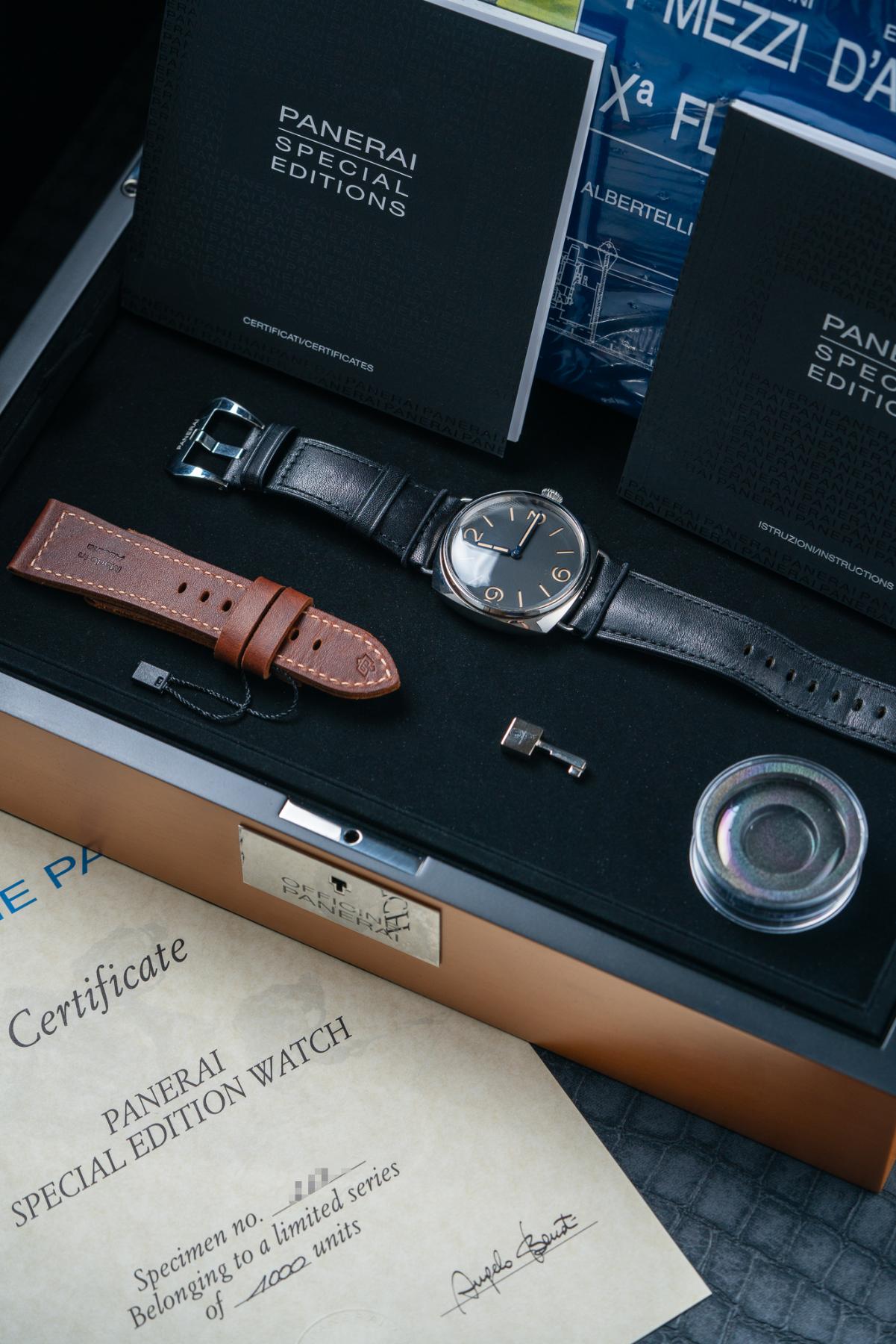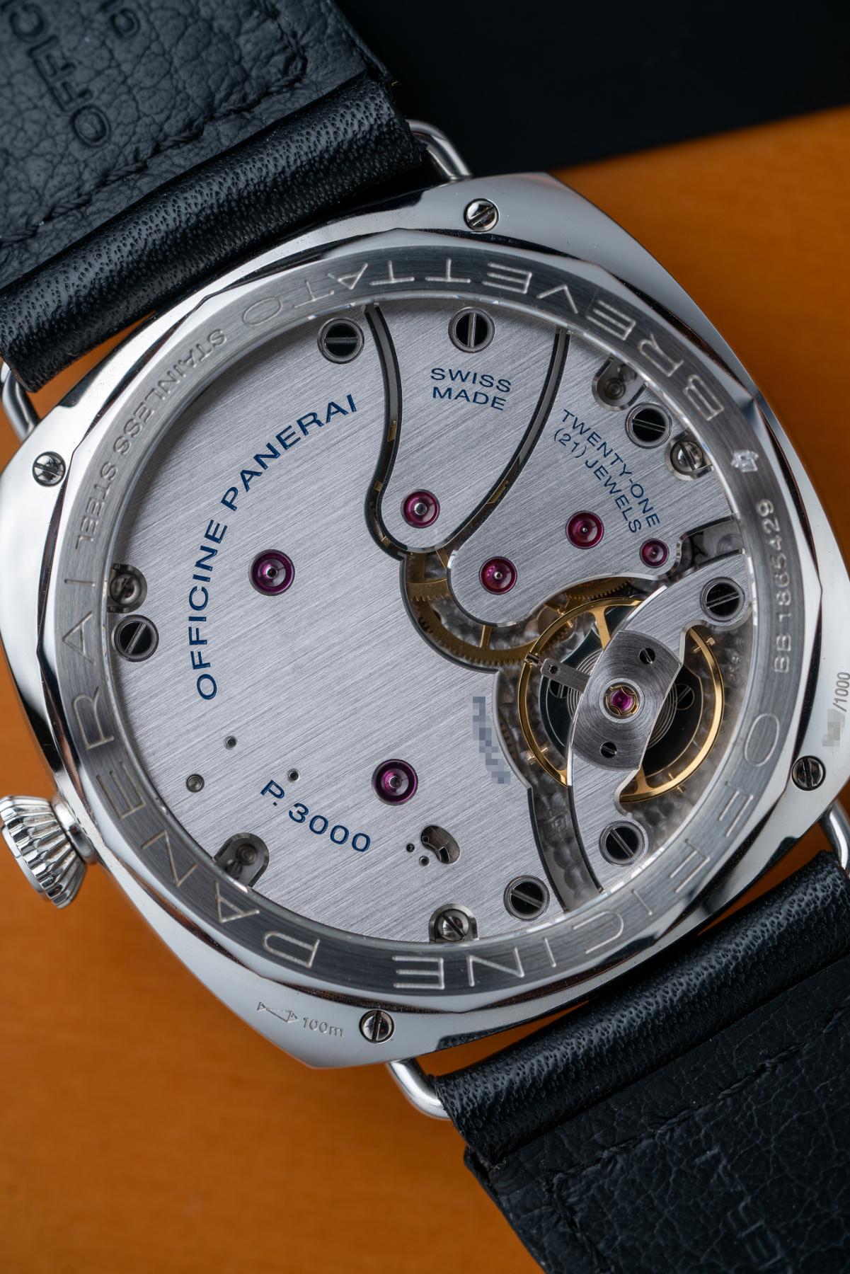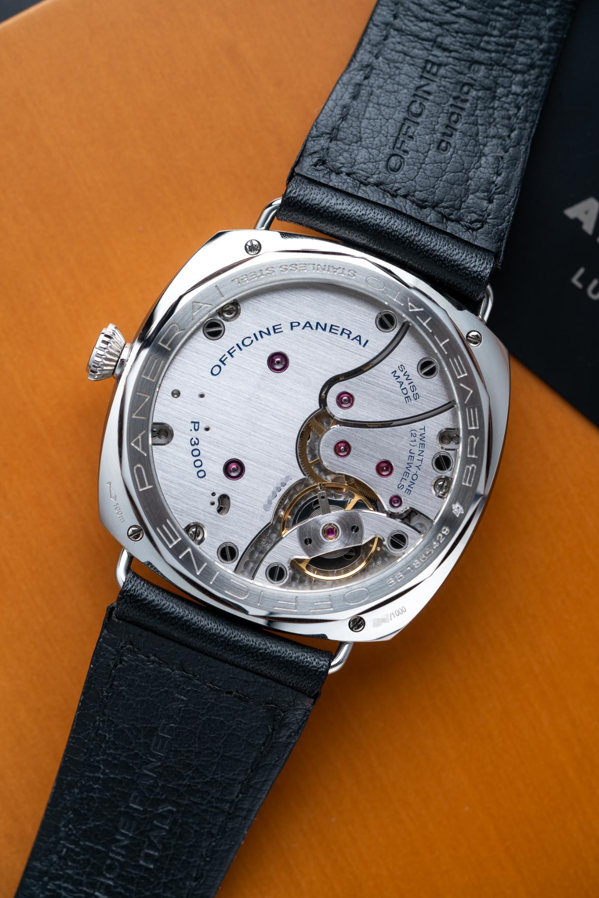 The Panerai Radiomir PAM00721 is a limited-edition timepiece in polished stainless steel, featuring a bold 47 mm cushion case, black sandwich dial, and blue-toned luminescent hour markers and hands. Underneath is the hand-wound in-house Calibre P.3000 movement, offering a substantial three-day (72-hour) power reserve and visible through the exhibition caseback. The striking vintage-inspired dial is printed “ANONIMO” (no logo) in homage to the original military watches of the 1930s. Paired with a brown leather strap, this 1 000-piece edition blends heritage styling with modern craftsmanship—perfect for collectors seeking a standout statement piece.