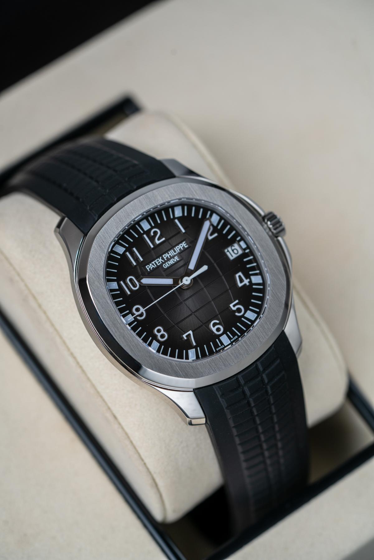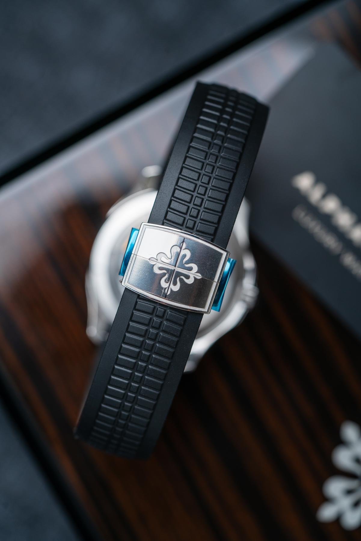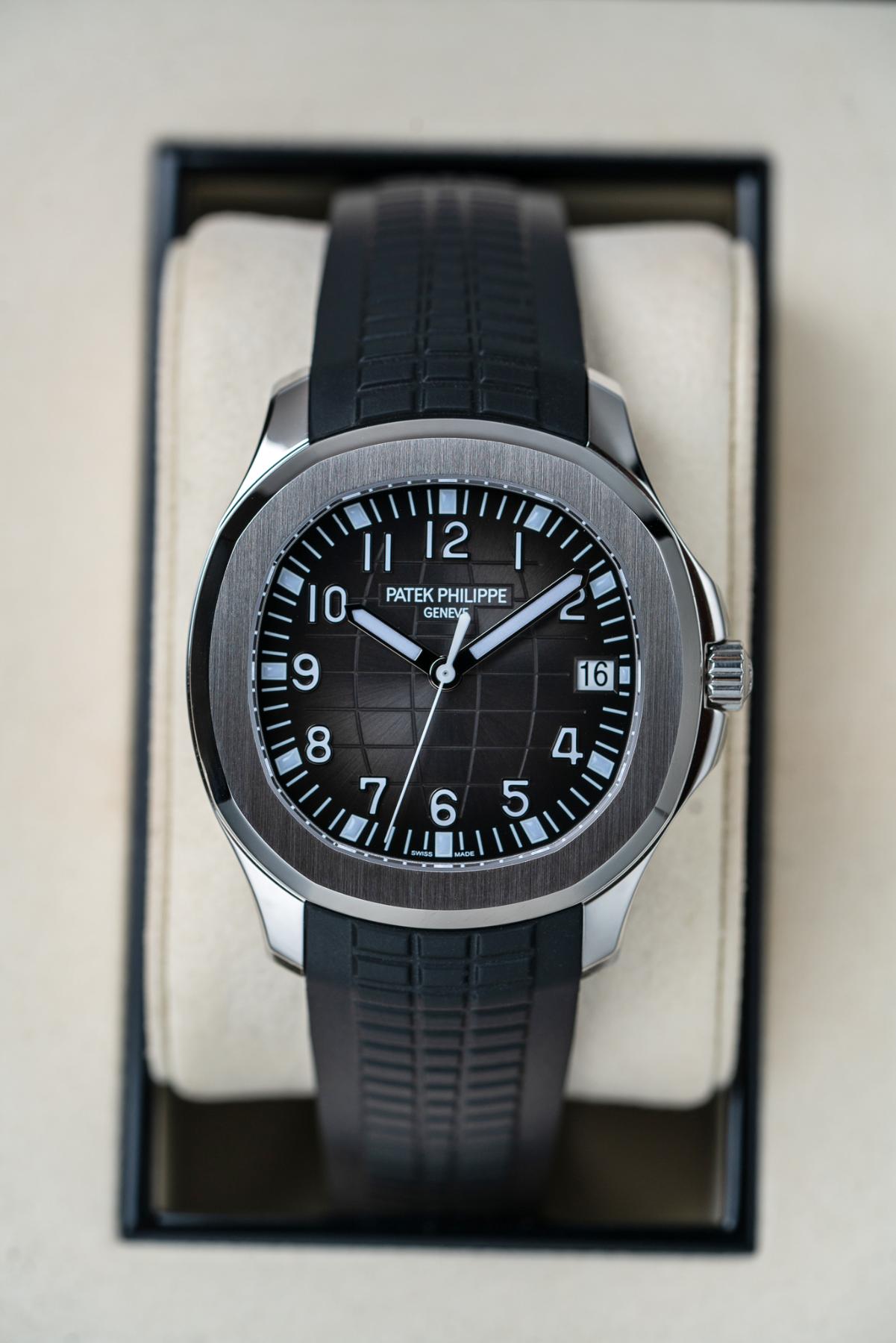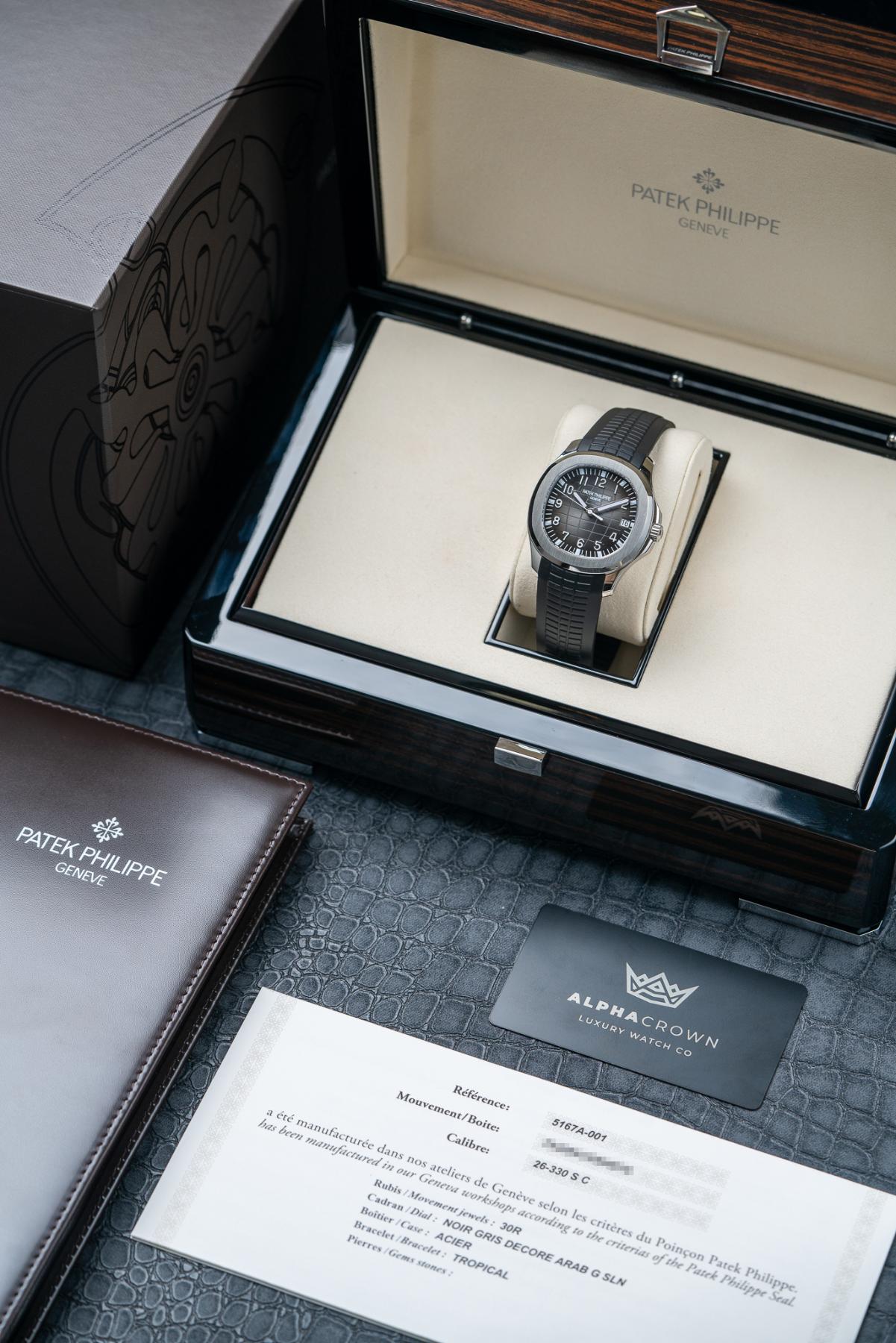 The 5167A-001 is a sporty, modern classic from Patek Philippe’s Aquanaut line. The watch has a 40.8 mm stainless steel case, around 8.1 mm thick, combining brushed and polished finishes. It features an embossed black dial with applied Arabic numerals coated in luminescent material, a date window at 3 o’clock, and sweep seconds. The strap is a black “Tropical” composite rubber strap engineered for durability, resistant to UV and water. Inside is the automatic Patek Philippe Caliber 26-330 S C (also called 324 S C), offering about 45 hours power reserve. The case back is sapphire crystal, allowing a full view of the movement. Water resistance is up to 120 meters, making it both functional and versatile.