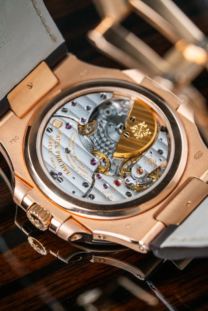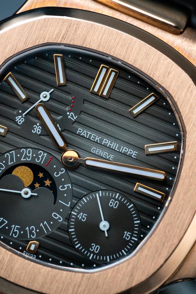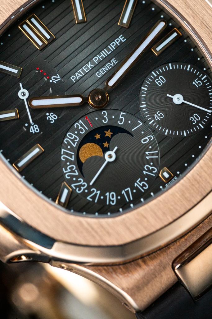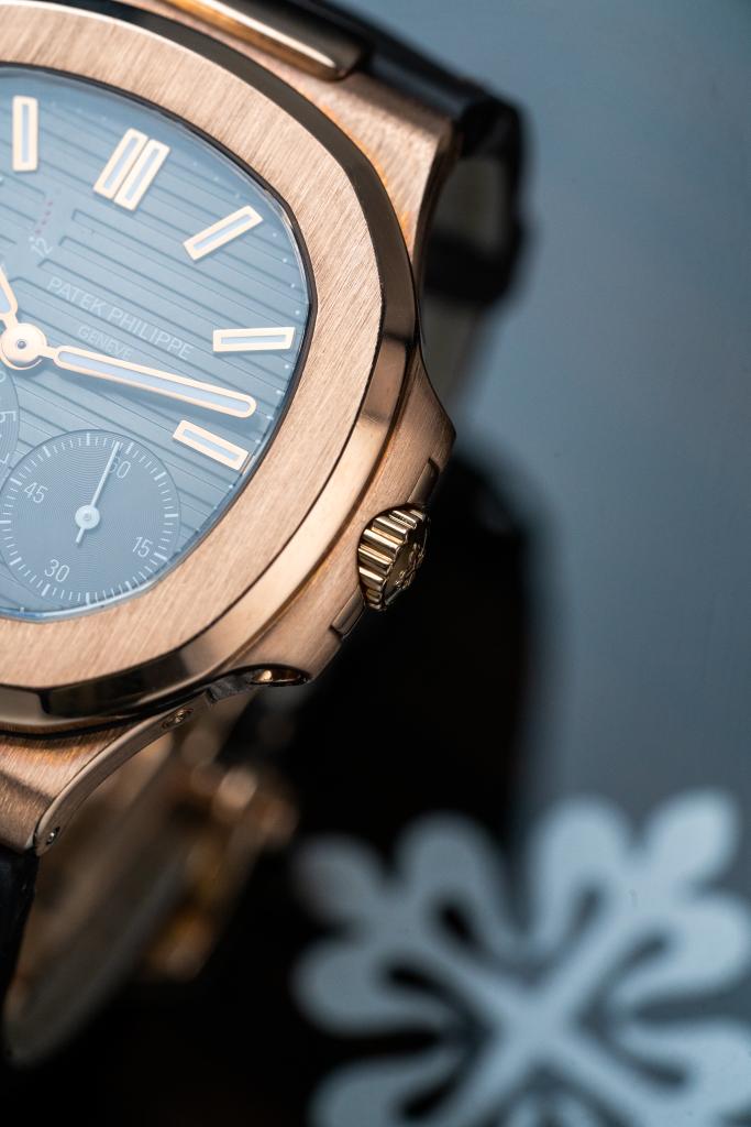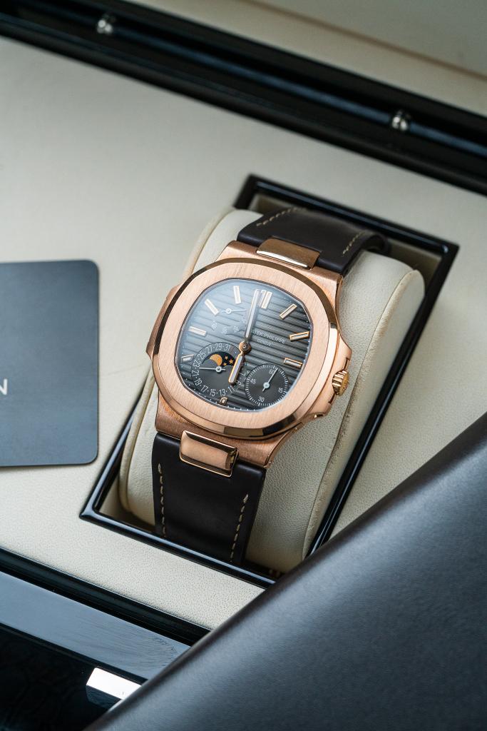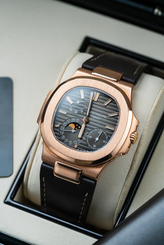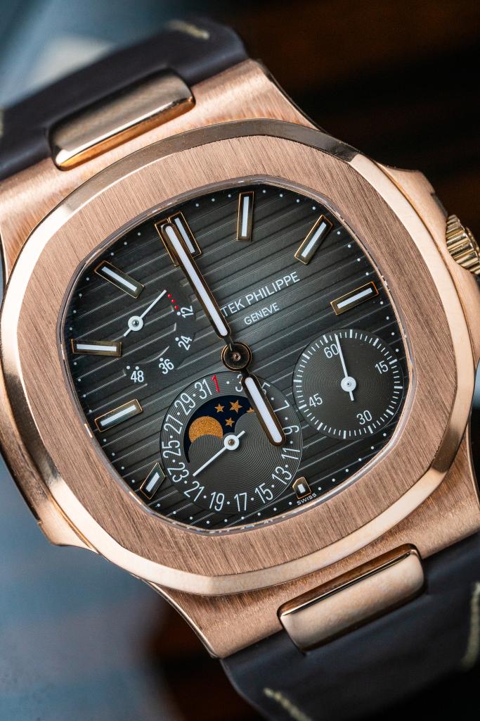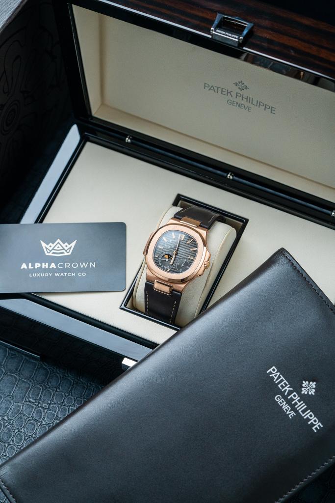 Patek Philippe Nautilus Ref. 5712R is crafted in 18k pink gold, featuring a 40mm case and a rich brown sunburst dial with signature offset displays for date, moonphase, and power reserve. Powered by the ultra-thin Calibre 240 PS IRM C LU automatic movement, it offers a 48-hour power reserve and a beautifully finished sapphire caseback. Paired with a matching brown alligator leather strap, the 5712R blends refined complication with the unmistakable Nautilus design, making it a highly coveted piece for collectors.