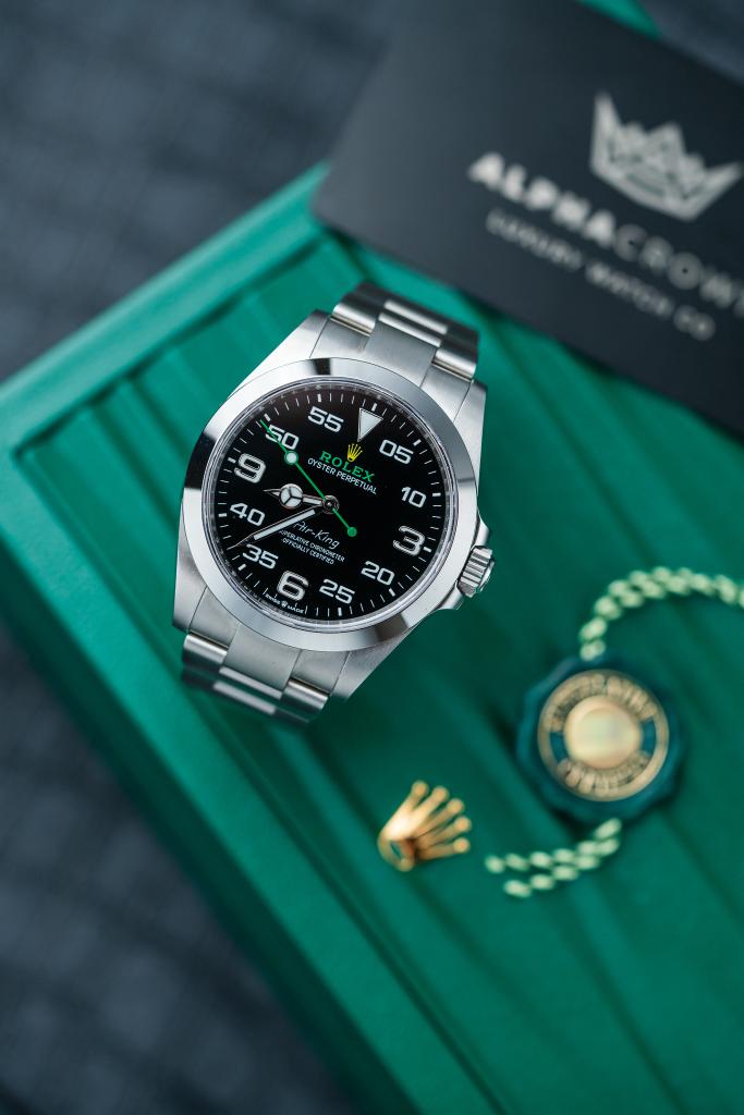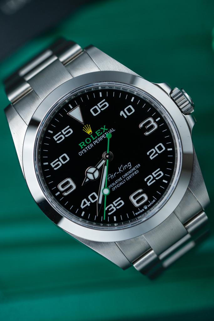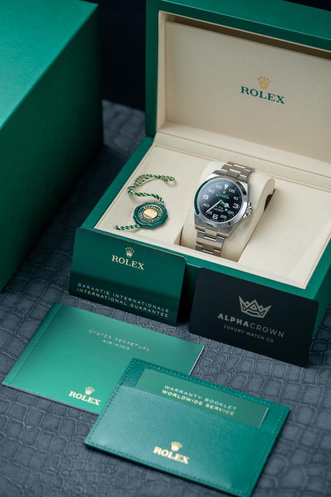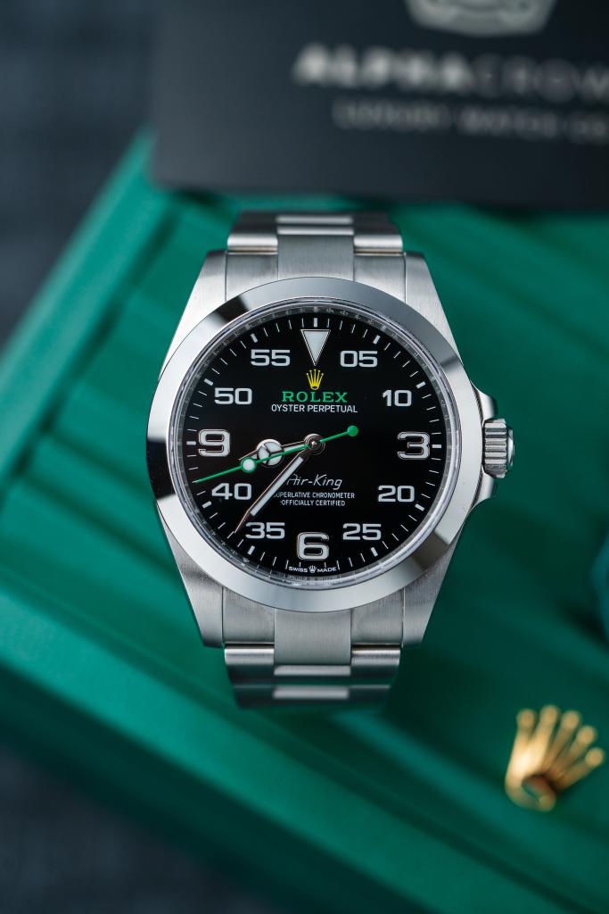 The Rolex Air-King 126900 is an iconic, precision-engineered timepiece blending classic design with modern reliability. Featuring a 40mm stainless steel case and a sleek Oyster bracelet, this watch offers durability and comfort. Its clean black dial showcases luminous hour markers, a minute track, and a prominent Rolex logo, embodying timeless elegance. Powered by the reliable Caliber 3230 movement, it ensures precision and robustness. The Air-King 126900 is perfect for those who appreciate a refined, versatile watch that complements both casual and formal attire.