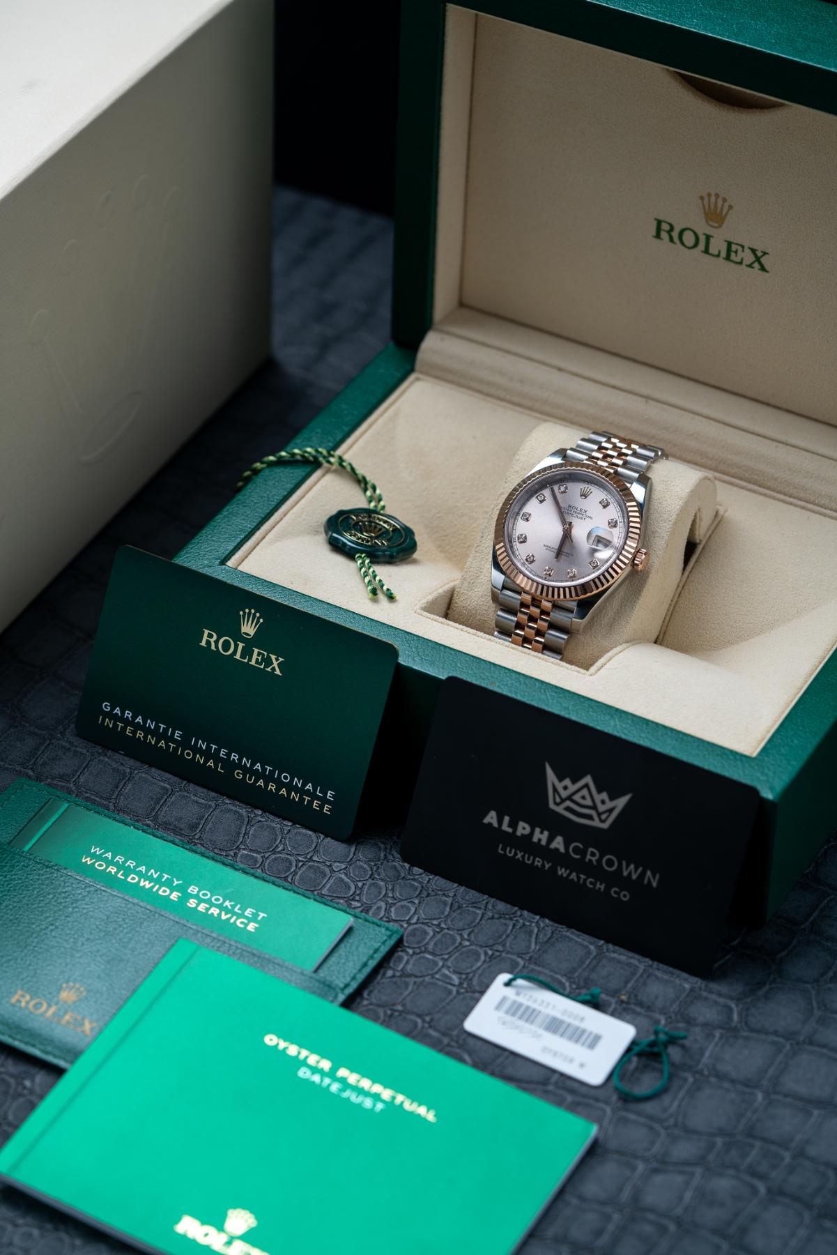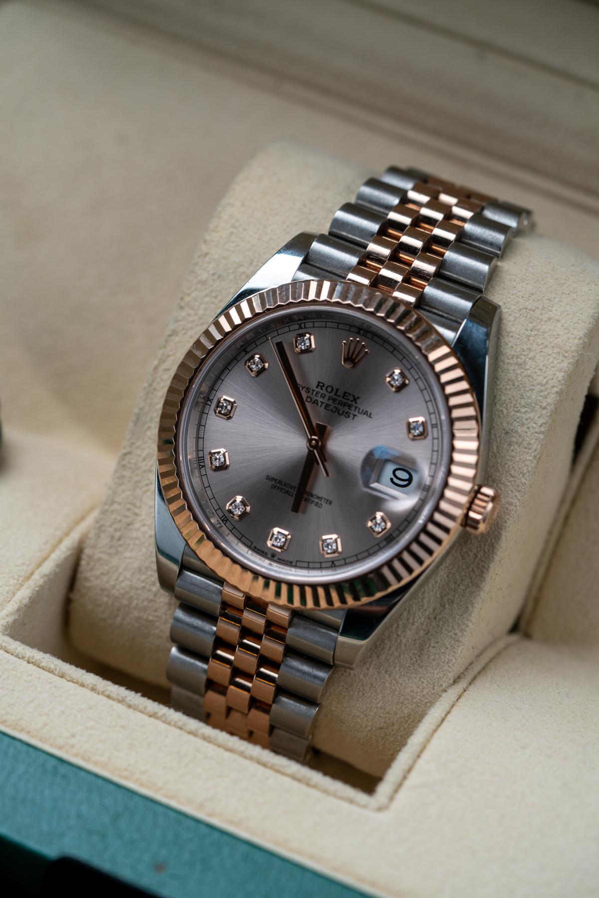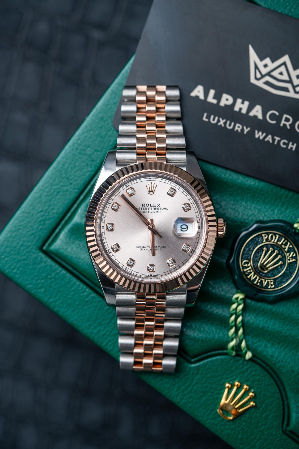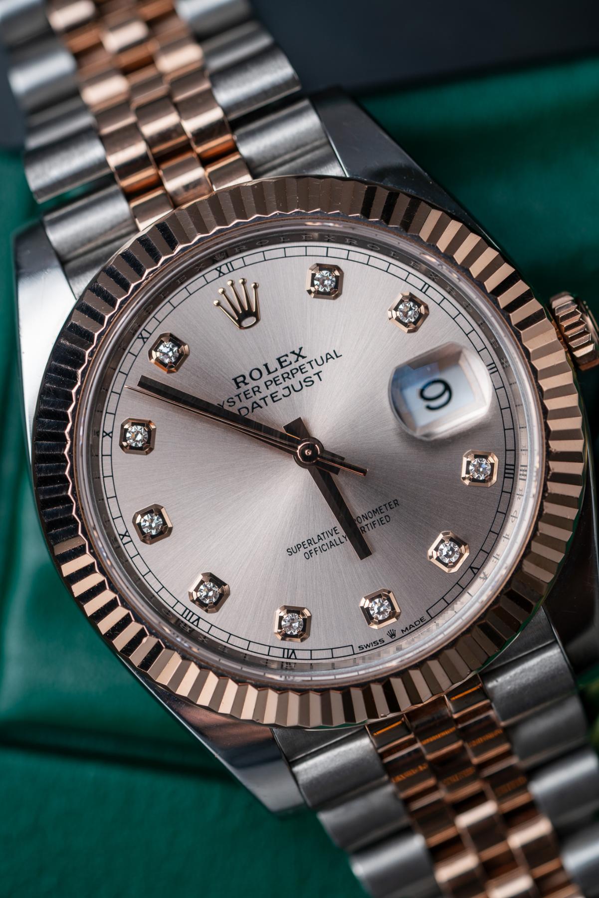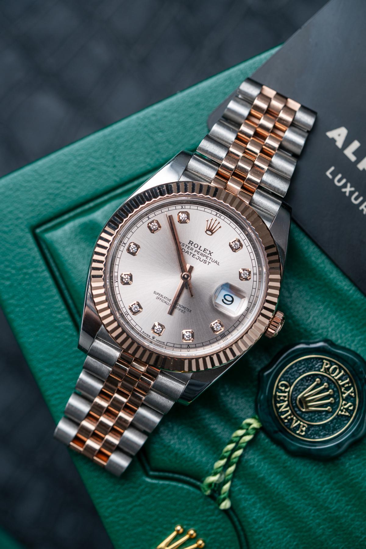 The Rolex Datejust 41 Ref. 126331 with sundust pink diamond dial is an elegant expression of modern luxury, crafted in Everose Rolesor, combining Oystersteel with 18k Everose gold. Its 41 mm case is paired with a fluted Everose gold bezel and offered on either an Oyster or Jubilee bracelet. The warm sundust dial is accented with factory-set diamond hour markers, adding refined brilliance while maintaining classic Datejust balance. A date window at 3 o’clock with the Cyclops lens enhances functionality. Powered by the Rolex Caliber 3235, the watch offers a 70-hour power reserve, Chronergy escapement, and Superlative Chronometer precision, making it a timeless and sophisticated choice.
