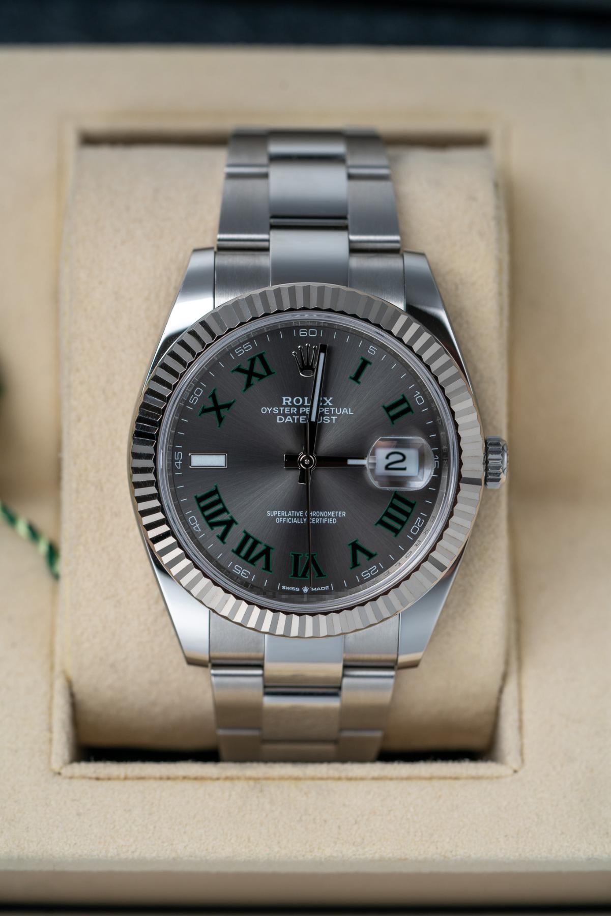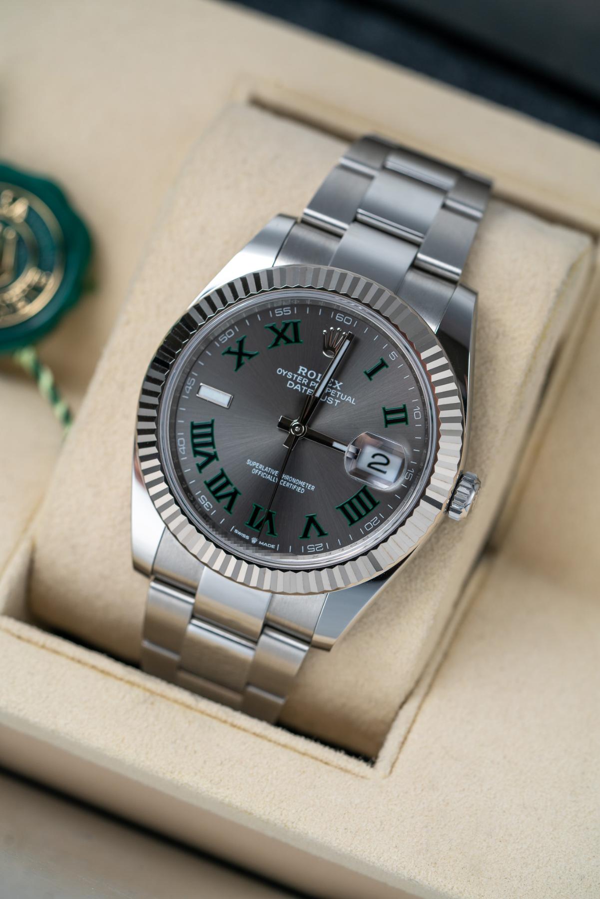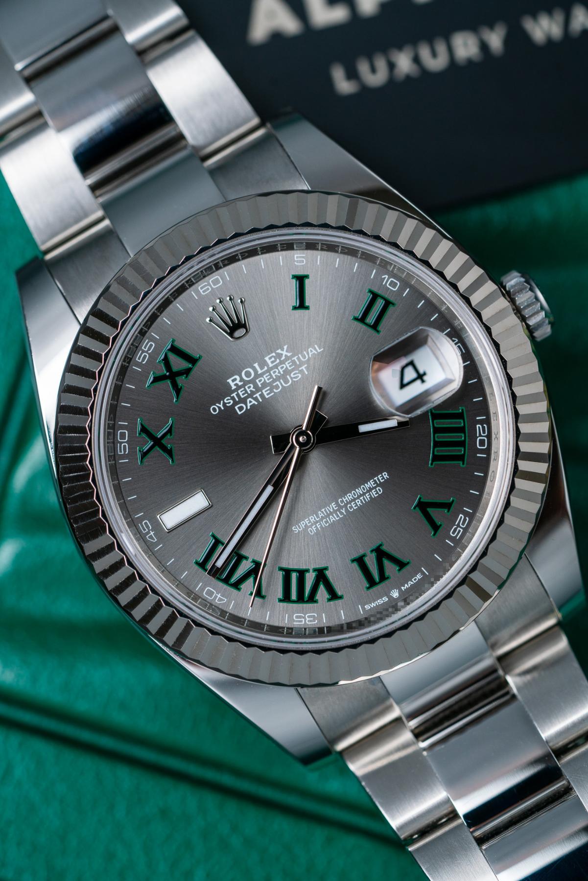 The Rolex Datejust 41 Ref. 126334 “Wimbledon” is a refined luxury watch that pairs classic elegance with distinctive styling. Its 41 mm Oystersteel and 18k white gold case features a fluted bezel and is fitted with either an Oyster or Jubilee bracelet. The striking slate gray sunray dial, nicknamed the Wimbledon dial, is highlighted by bold green Roman numerals and a date display at 3 o’clock beneath the Cyclops lens. Powered by the Caliber 3235, it delivers a 70-hour power reserve, Chronergy escapement, and Superlative Chronometer precision. The 126334 Wimbledon is a highly sought-after Datejust configuration, blending tradition with modern Rolex innovation.