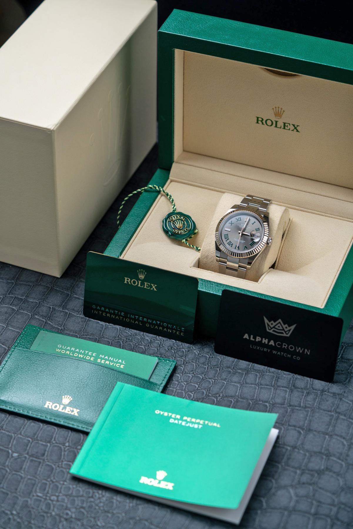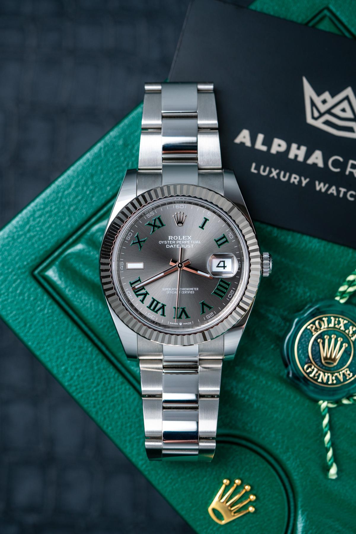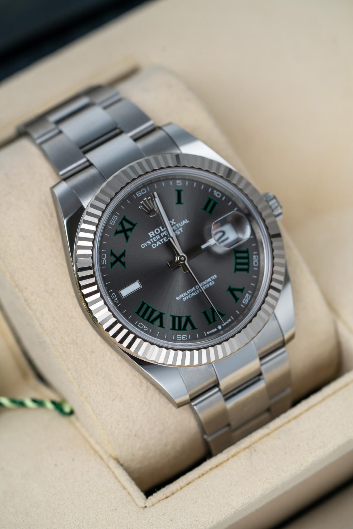 The Rolex Datejust 41 Ref. 126334 “Wimbledon” is a refined luxury watch that pairs classic elegance with distinctive styling. Its 41 mm Oystersteel and 18k white gold case features a fluted bezel and is fitted with either an Oyster or Jubilee bracelet. The striking slate gray sunray dial, nicknamed the Wimbledon dial, is highlighted by bold green Roman numerals and a date display at 3 o’clock beneath the Cyclops lens. Powered by the Caliber 3235, it delivers a 70-hour power reserve, Chronergy escapement, and Superlative Chronometer precision. The 126334 Wimbledon is a highly sought-after Datejust configuration, blending tradition with modern Rolex innovation.