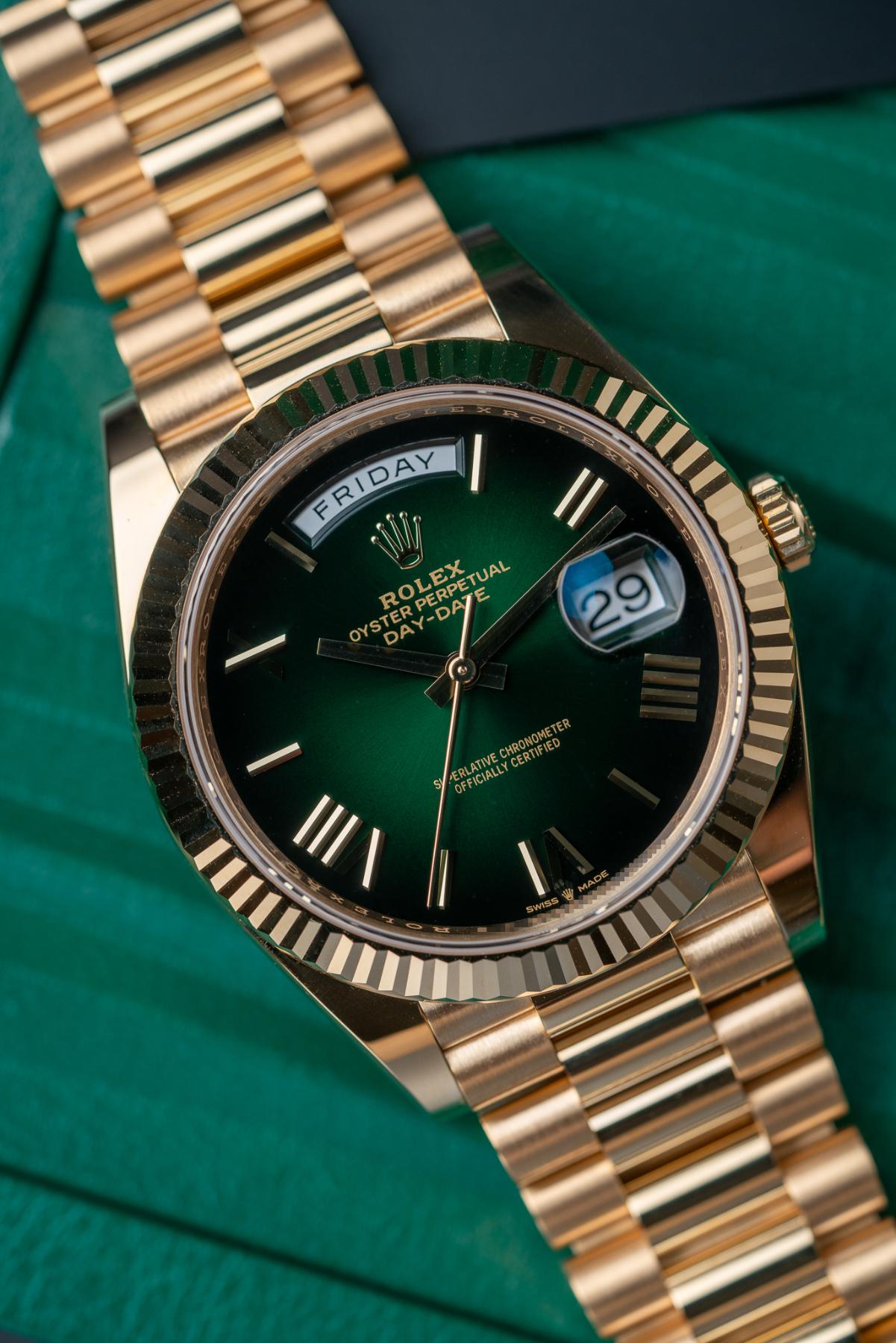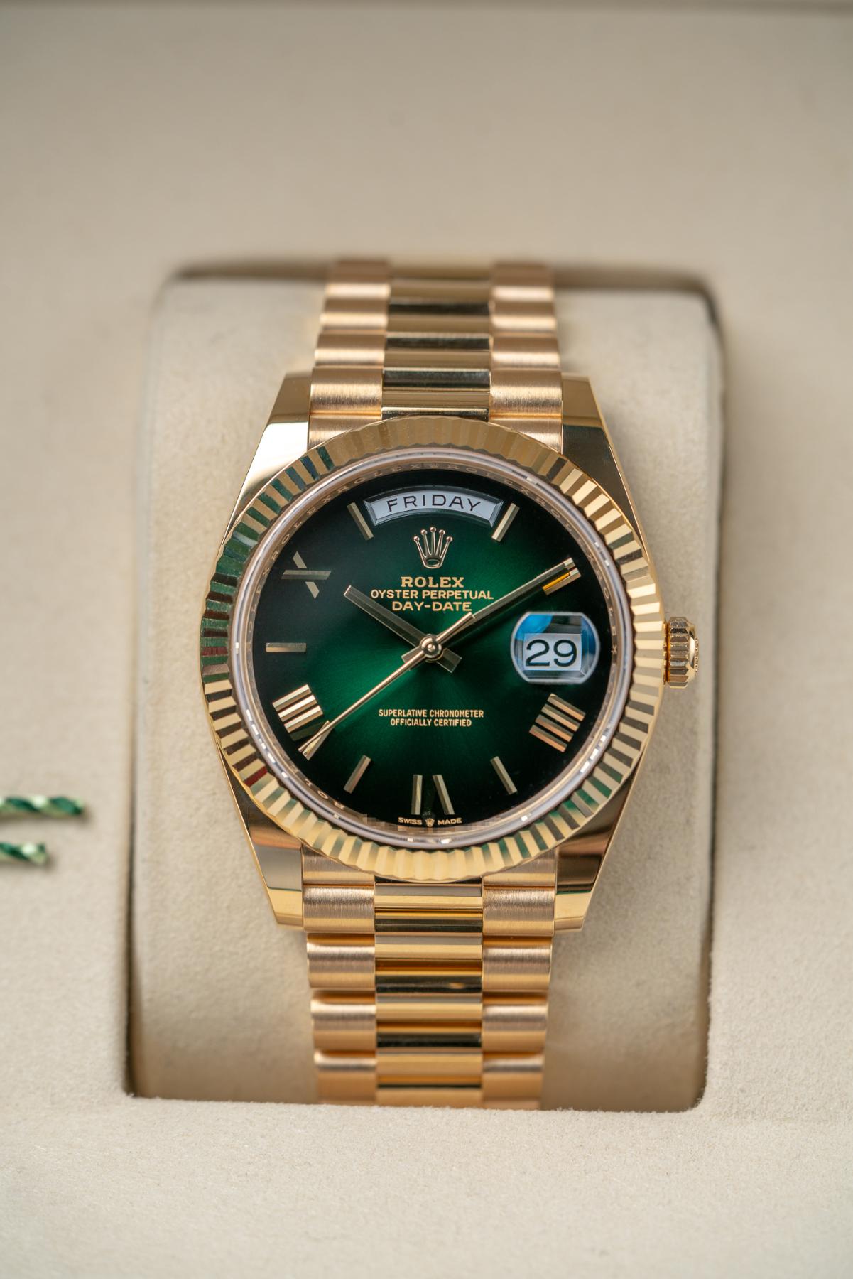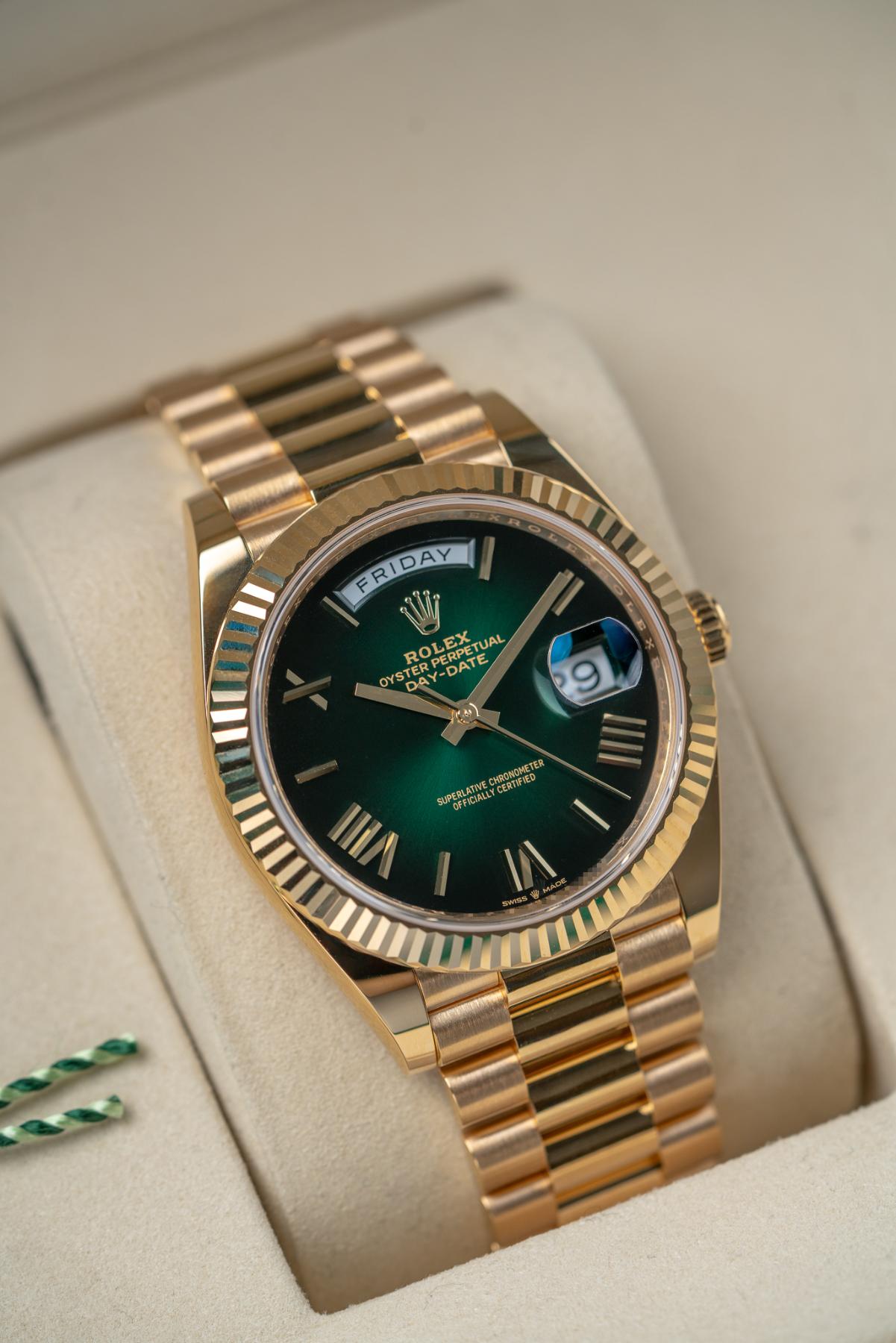 The Rolex Day-Date 40 Ref. 228238 with green ombré dial is a striking expression of luxury and Rolex’s mastery of design. Crafted in 18k yellow gold, this 40 mm timepiece features a fluted bezel and the iconic President bracelet. The gradient dial starts with rich green at the center and transitions to deep black at the edges, enhanced with Roman numerals or gold hour markers. It displays the day at 12 o’clock and the date at 3 o’clock under a Cyclops lens. Powered by the Caliber 3255, it delivers a 70-hour power reserve, Parachrom hairspring, Chronergy escapement, and is certified a Superlative Chronometer. With water resistance to 100 m and scratch-resistant sapphire crystal, the 228238 green ombré is a bold statement piece that combines prestige, performance, and visual drama.