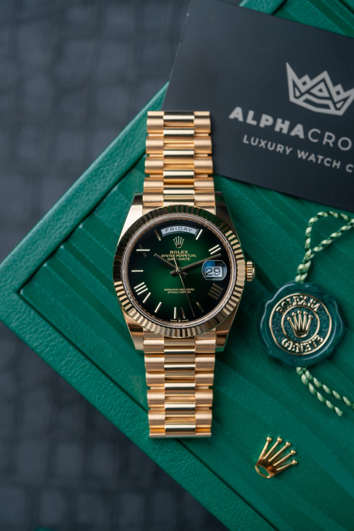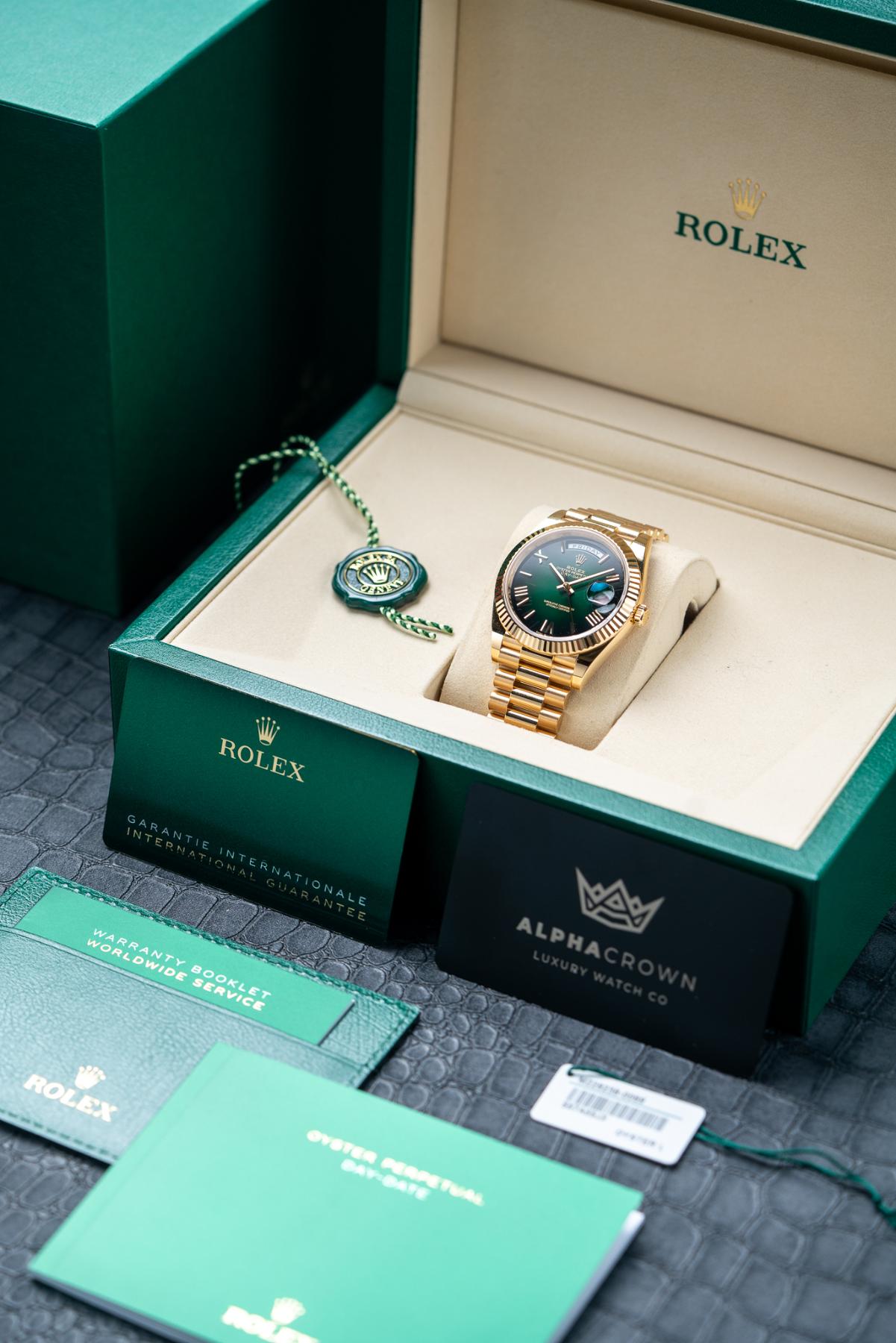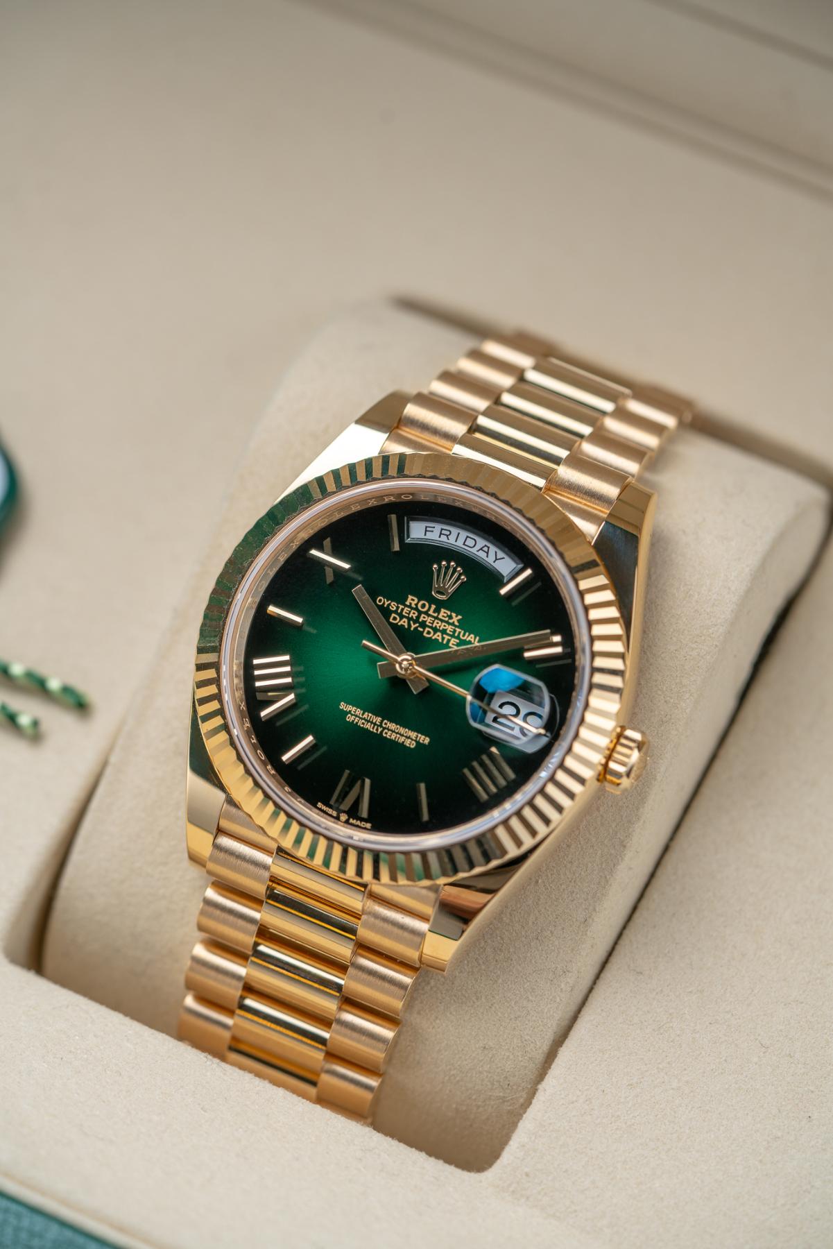 The Rolex Day-Date 40 Ref. 228238 with green ombré dial is a striking expression of luxury and Rolex’s mastery of design. Crafted in 18k yellow gold, this 40 mm timepiece features a fluted bezel and the iconic President bracelet. The gradient dial starts with rich green at the center and transitions to deep black at the edges, enhanced with Roman numerals or gold hour markers. It displays the day at 12 o’clock and the date at 3 o’clock under a Cyclops lens. Powered by the Caliber 3255, it delivers a 70-hour power reserve, Parachrom hairspring, Chronergy escapement, and is certified a Superlative Chronometer. With water resistance to 100 m and scratch-resistant sapphire crystal, the 228238 green ombré is a bold statement piece that combines prestige, performance, and visual drama.