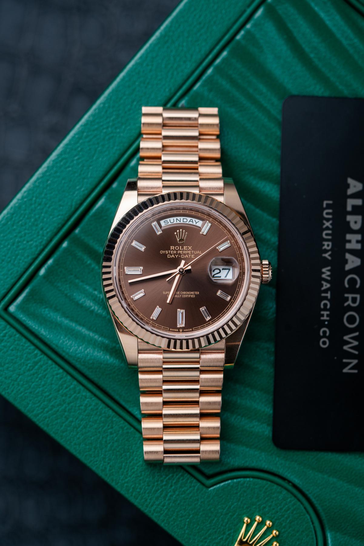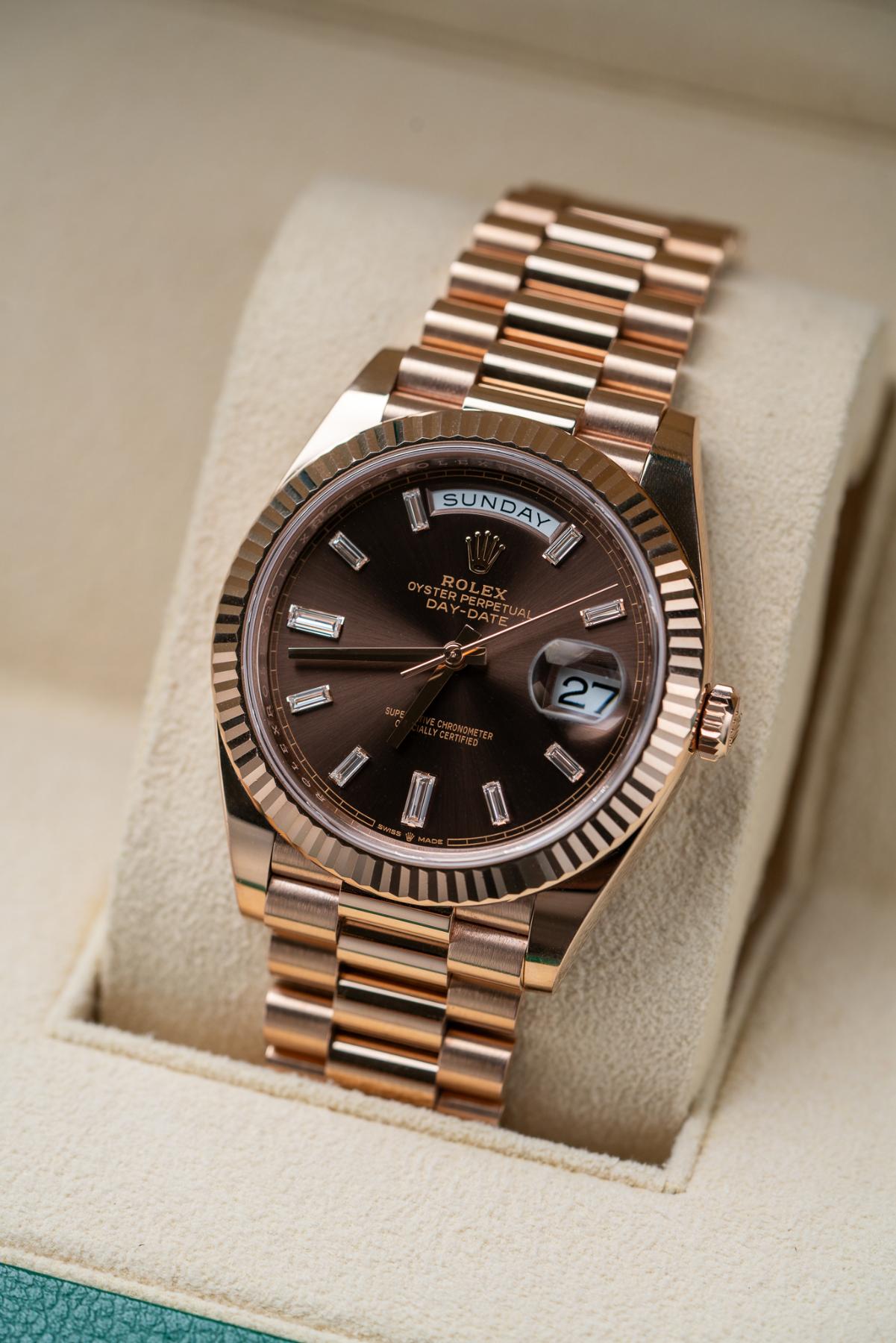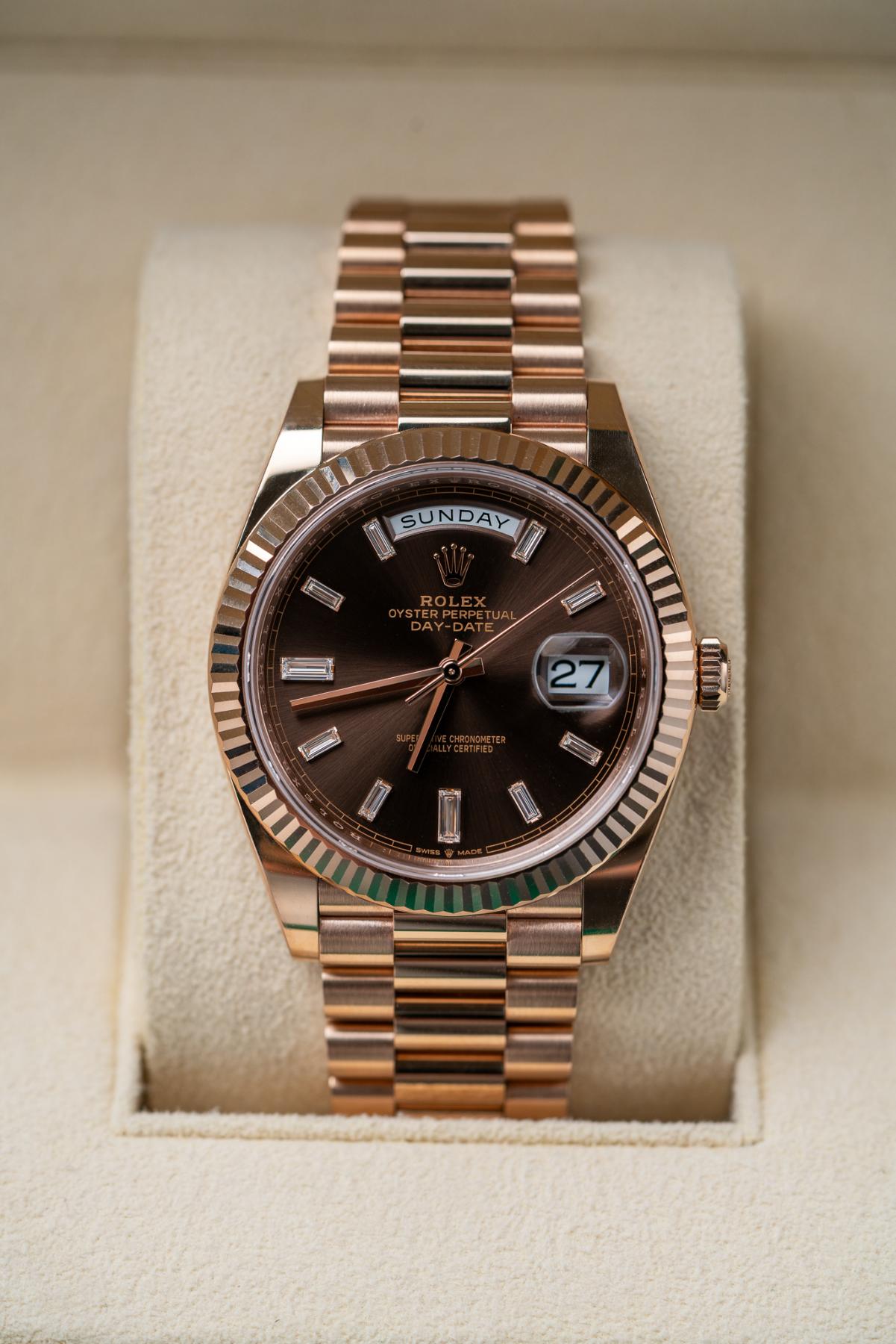 The Rolex Day-Date 40 Ref. 228235 in 18k Everose gold is a luxurious statement piece, showcasing a rich chocolate sunburst dial adorned with baguette-cut diamond hour markers. Its 40mm case, fluted bezel, and iconic President bracelet embody timeless prestige. Powered by the Rolex Caliber 3255, it offers a 70-hour power reserve, exceptional accuracy, and the signature day and date display, all presented under a Cyclops lens. Water-resistant to 100 meters, the 228235 blends refinement with durability. This exquisite configuration is ideal for collectors seeking a rare, gem-set Rolex that exudes elegance, exclusivity, and modern sophistication.