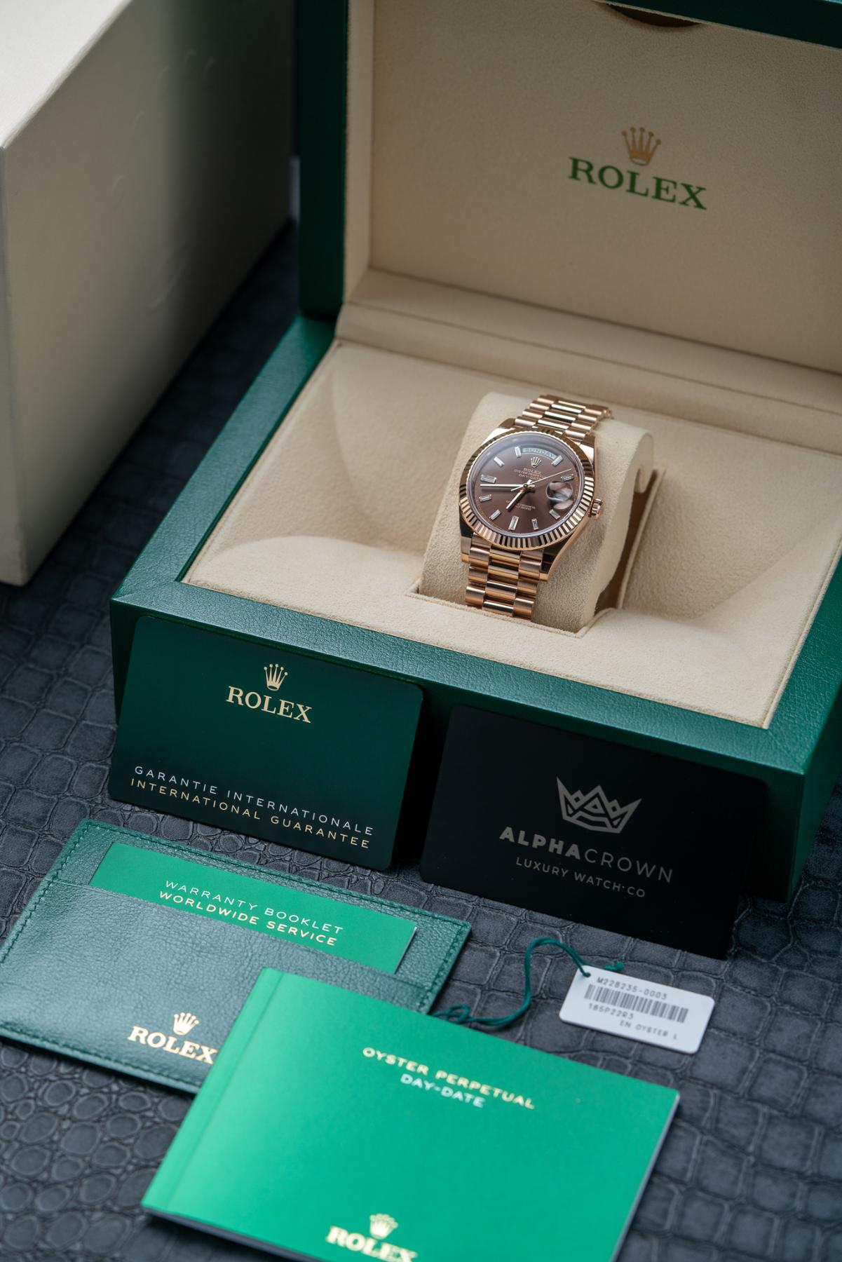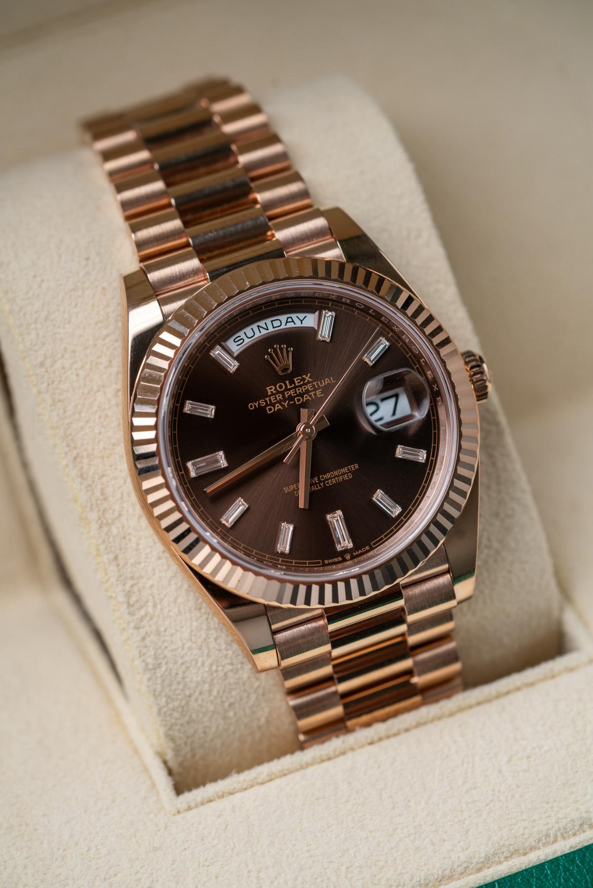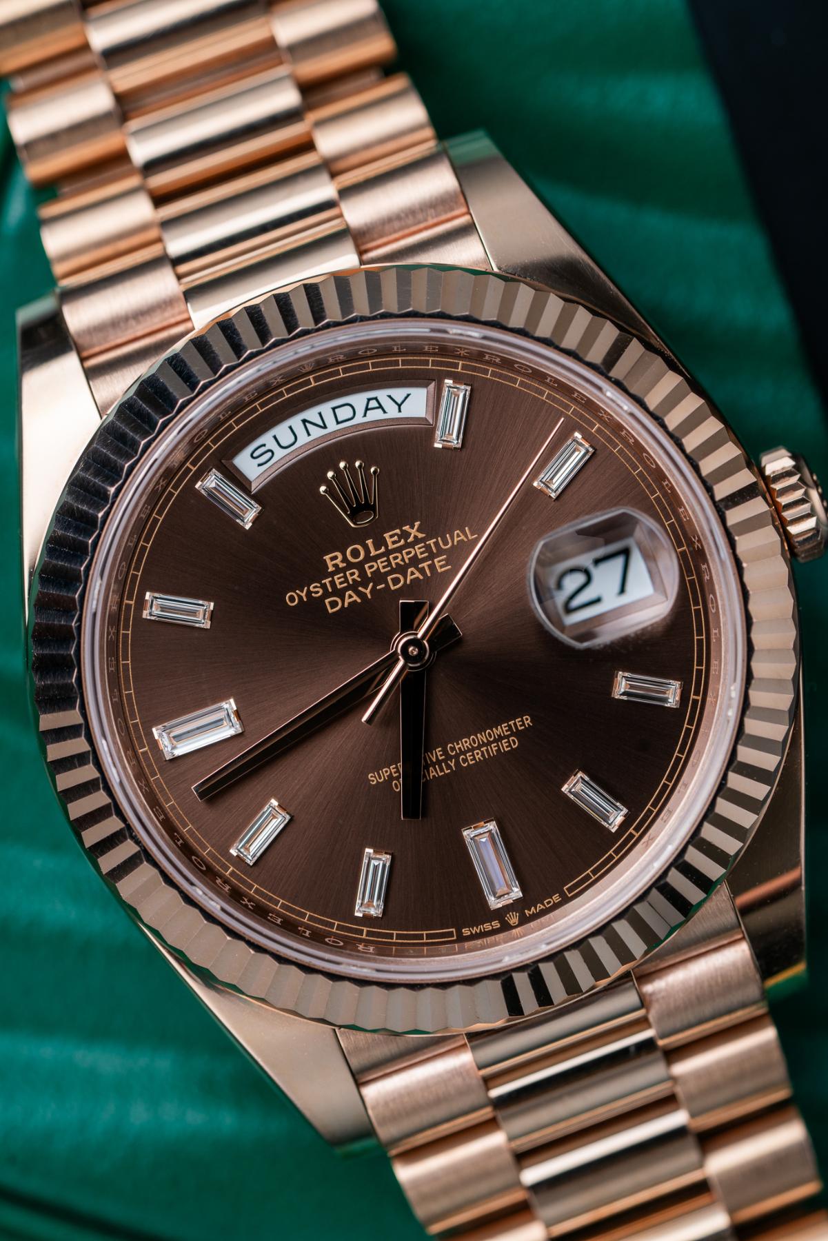 The Rolex Day-Date 40 Ref. 228235 in 18k Everose gold is a luxurious statement piece, showcasing a rich chocolate sunburst dial adorned with baguette-cut diamond hour markers. Its 40mm case, fluted bezel, and iconic President bracelet embody timeless prestige. Powered by the Rolex Caliber 3255, it offers a 70-hour power reserve, exceptional accuracy, and the signature day and date display, all presented under a Cyclops lens. Water-resistant to 100 meters, the 228235 blends refinement with durability. This exquisite configuration is ideal for collectors seeking a rare, gem-set Rolex that exudes elegance, exclusivity, and modern sophistication.