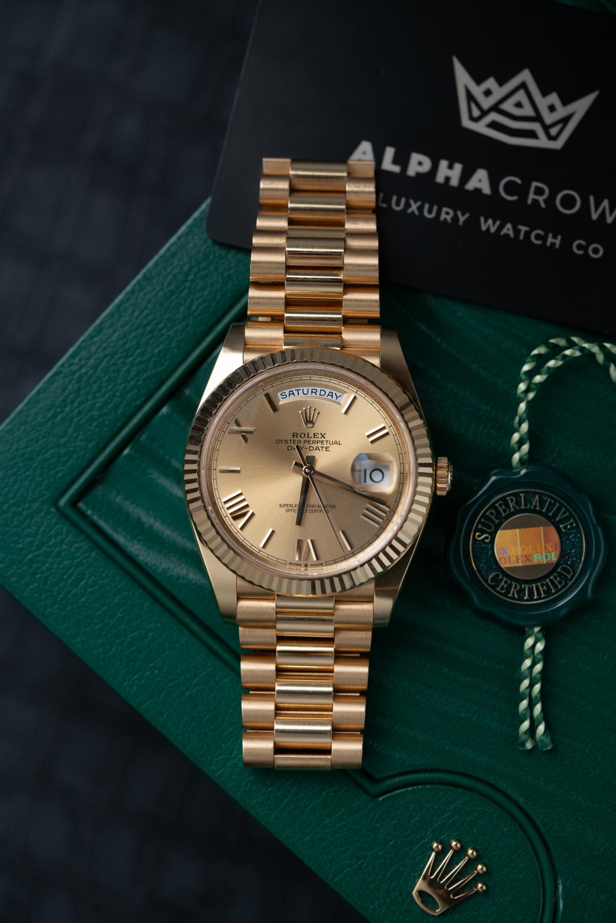 The Rolex Day-Date 40 Ref. 228238 is the ultimate symbol of prestige, crafted entirely in 18k yellow gold with a 40mm case, fluted bezel, and the iconic President bracelet. Its elegant dial displays the full day at 12 o’clock and the date at 3 o’clock under a Cyclops lens. Powered by the automatic Caliber 3255, it offers a 70-hour power reserve and Superlative Chronometer accuracy. The 228238 blends timeless design with modern performance, making it the definitive choice for those seeking a luxury gold Rolex with executive presence.