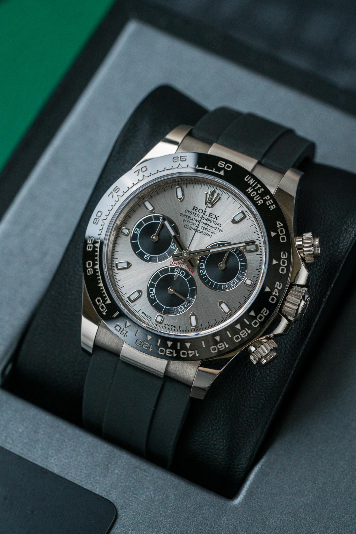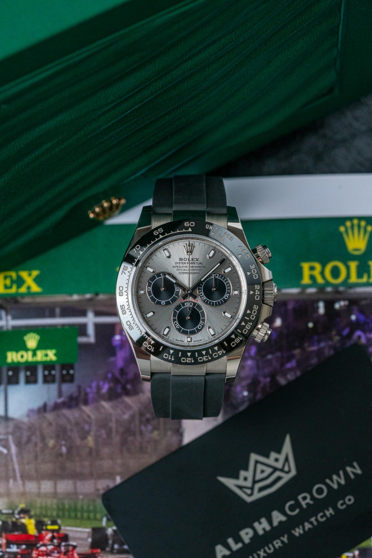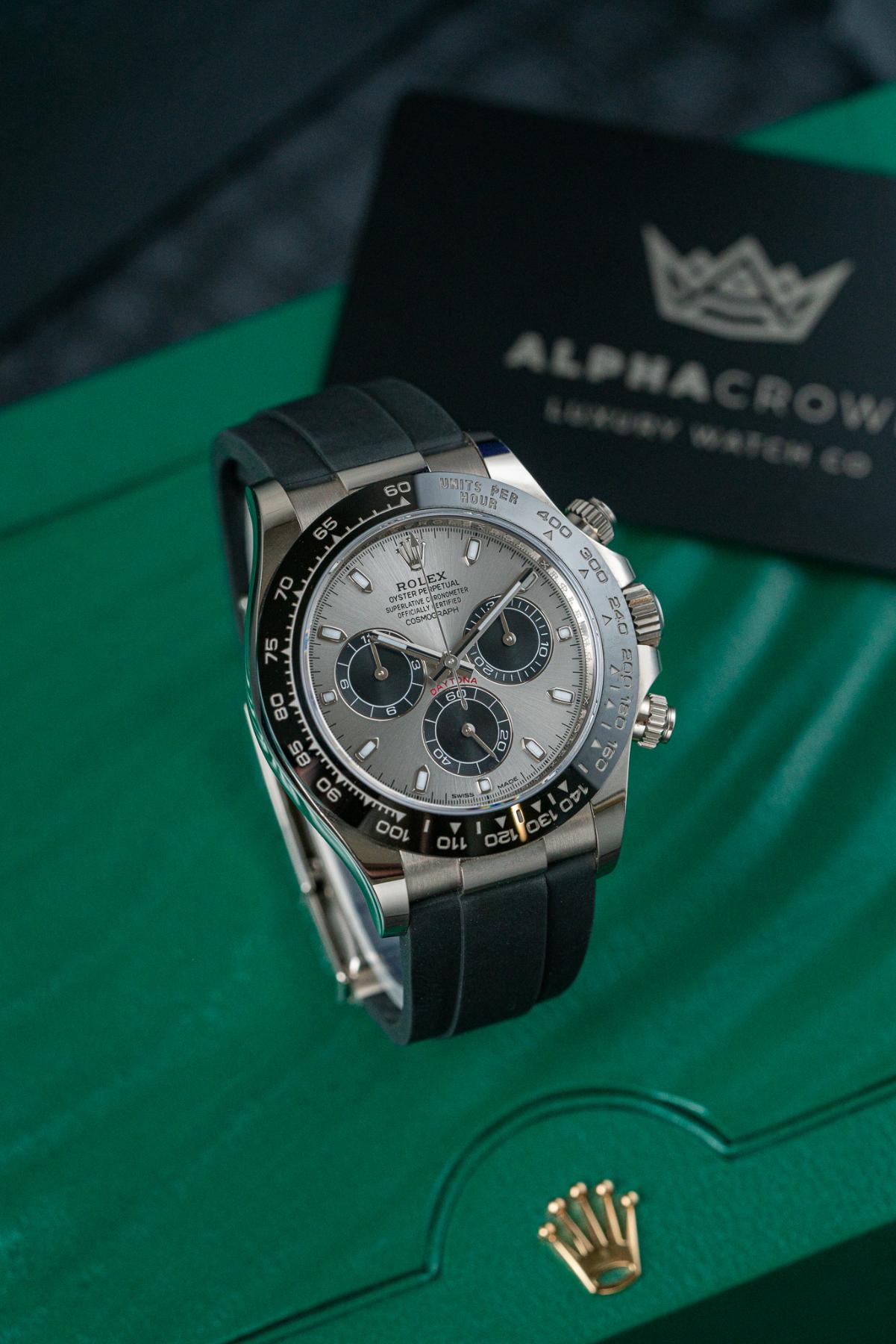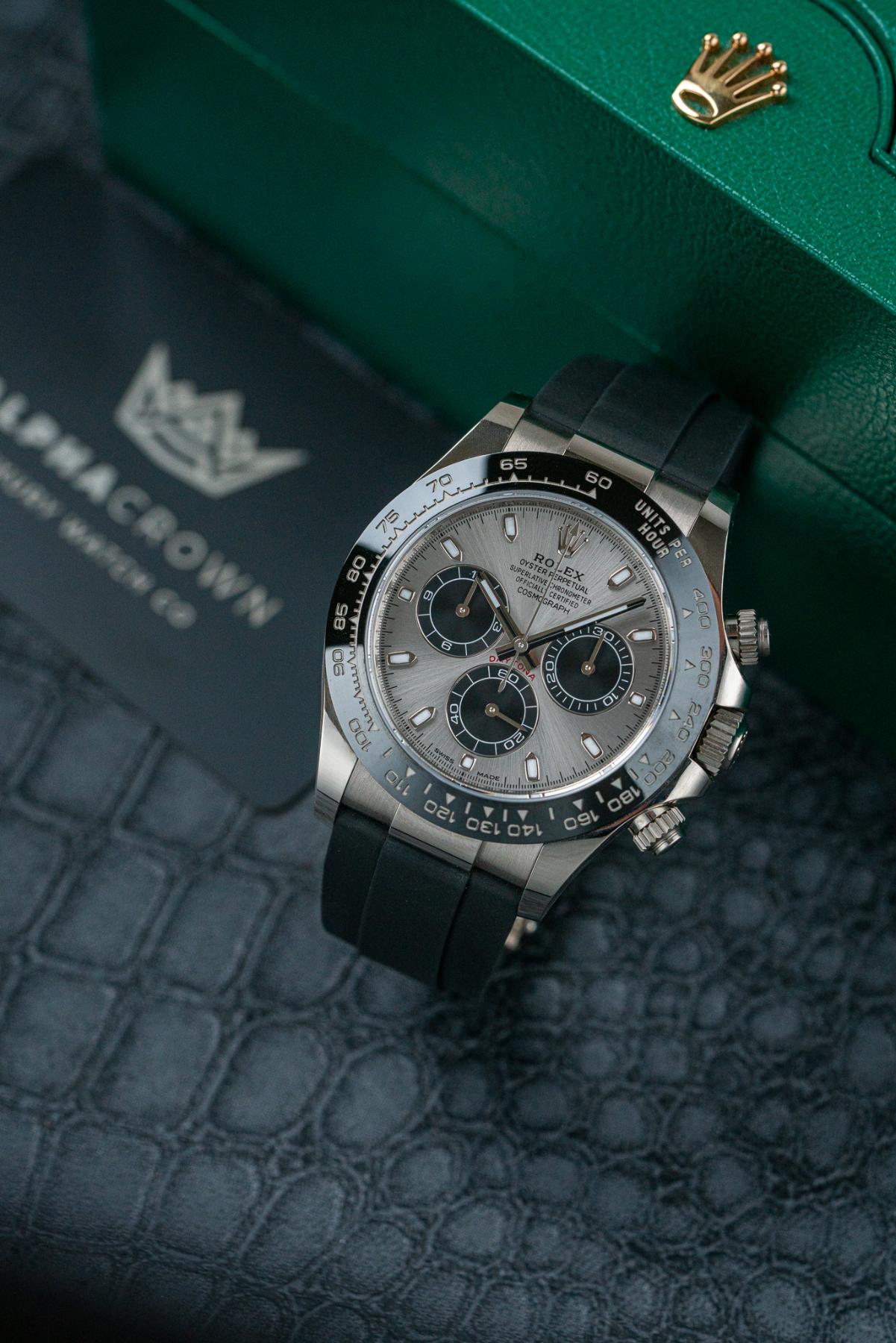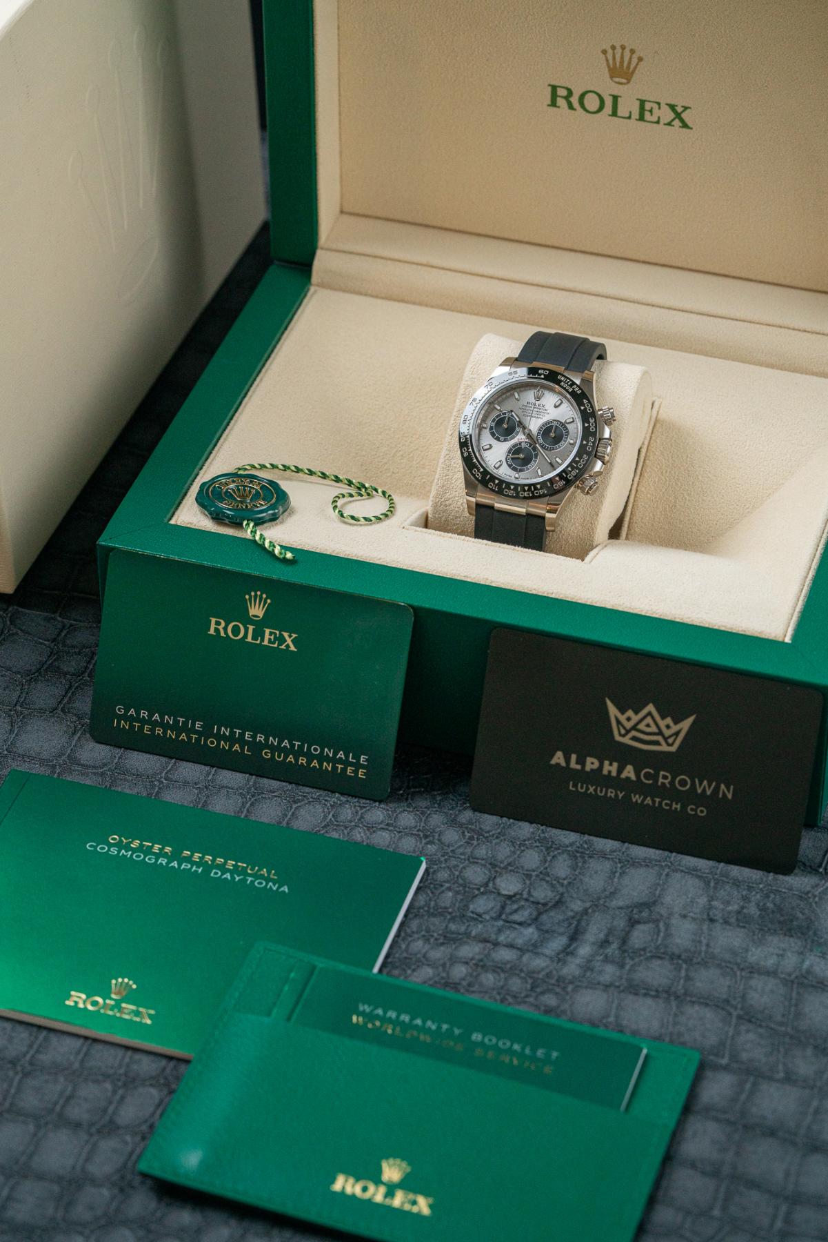 The Rolex Cosmograph Daytona 116519LN is a prestigious chronograph crafted in 18k white gold, combining luxury materials with legendary Daytona performance. Its 40 mm case is paired with a black Cerachrom ceramic bezel engraved with a tachymeter scale, creating a sleek and modern contrast. The dial is offered in several sought-after configurations, including black, blue, silver, and meteorite, featuring contrasting subdials and luminous hour markers for excellent legibility. Powered by the Rolex Caliber 4130, it delivers chronometer-certified precision and a 72-hour power reserve. Finished on the Oysterflex rubber strap with Oysterlock clasp, the 116519LN is a standout white gold Daytona built for collectors and enthusiasts.