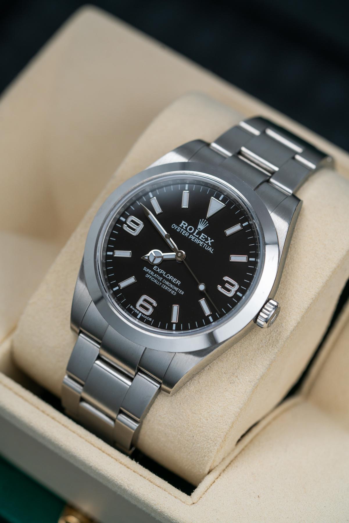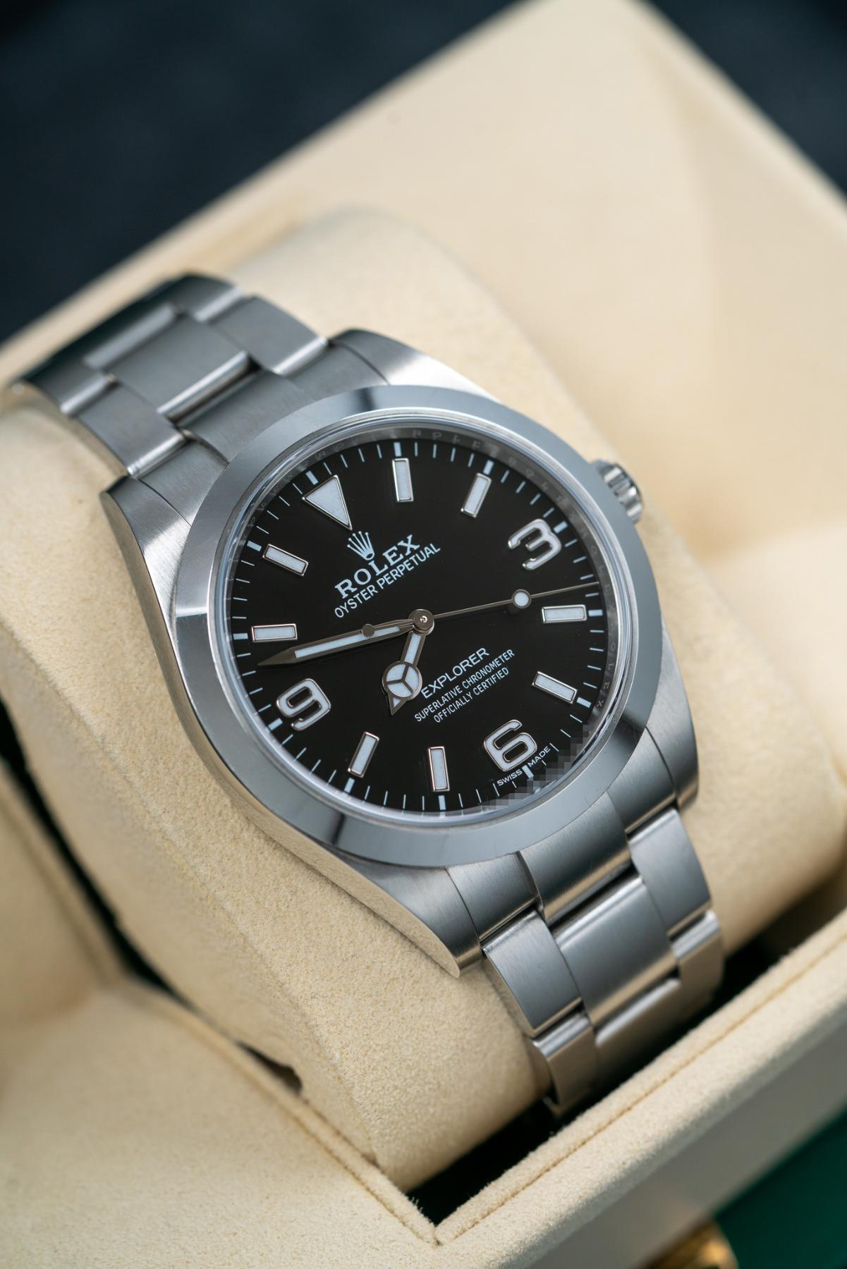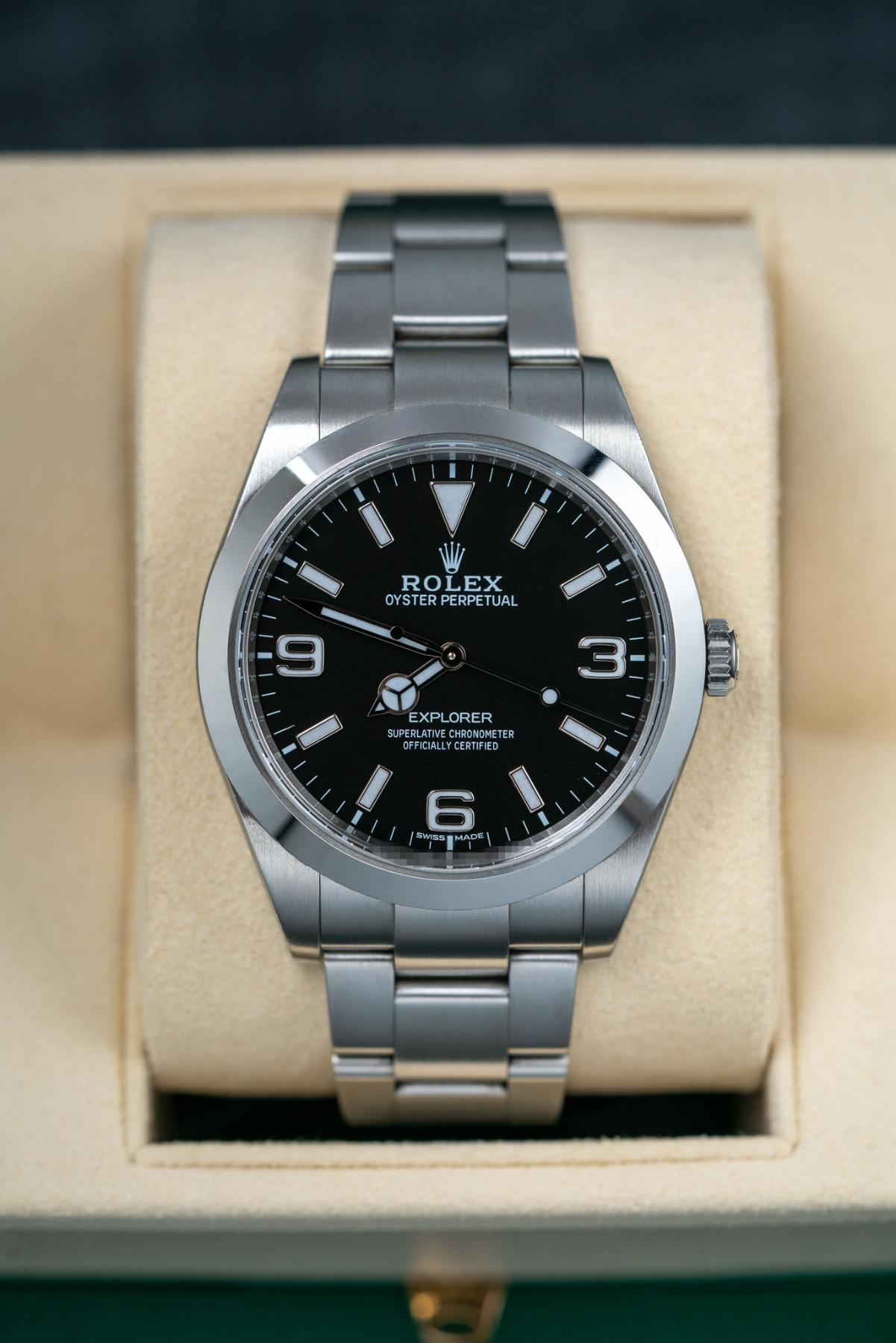 The Rolex Explorer I 214270 is a modern classic built for precision and endurance. Crafted from Oystersteel, it features a 39 mm case with a smooth bezel and a durable Oyster bracelet. The black dial showcases the signature 3-6-9 Arabic numerals and Chromalight luminous markers for superior visibility. Powered by the Caliber 3132, it delivers a 48-hour power reserve, Parachrom hairspring, and Paraflex shock absorbers for exceptional reliability. Water-resistant to 100 meters, the 214270 blends adventure-ready toughness with refined simplicity, making it a versatile Rolex for explorers and everyday wear alike.