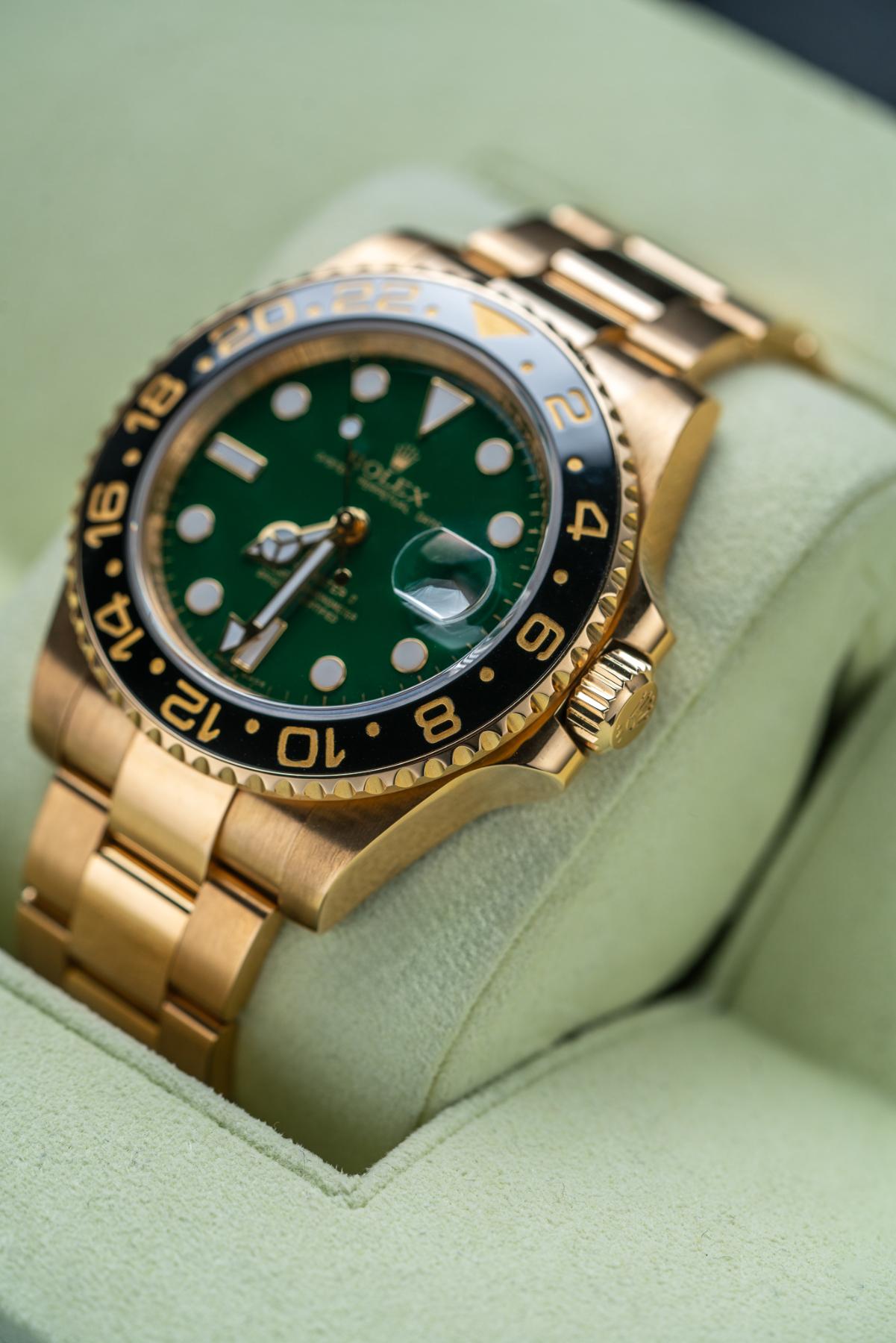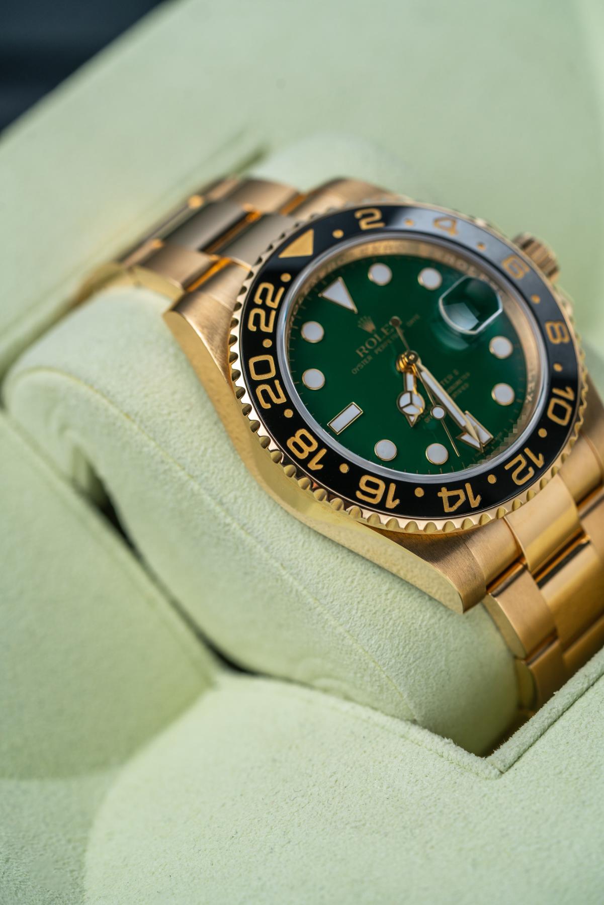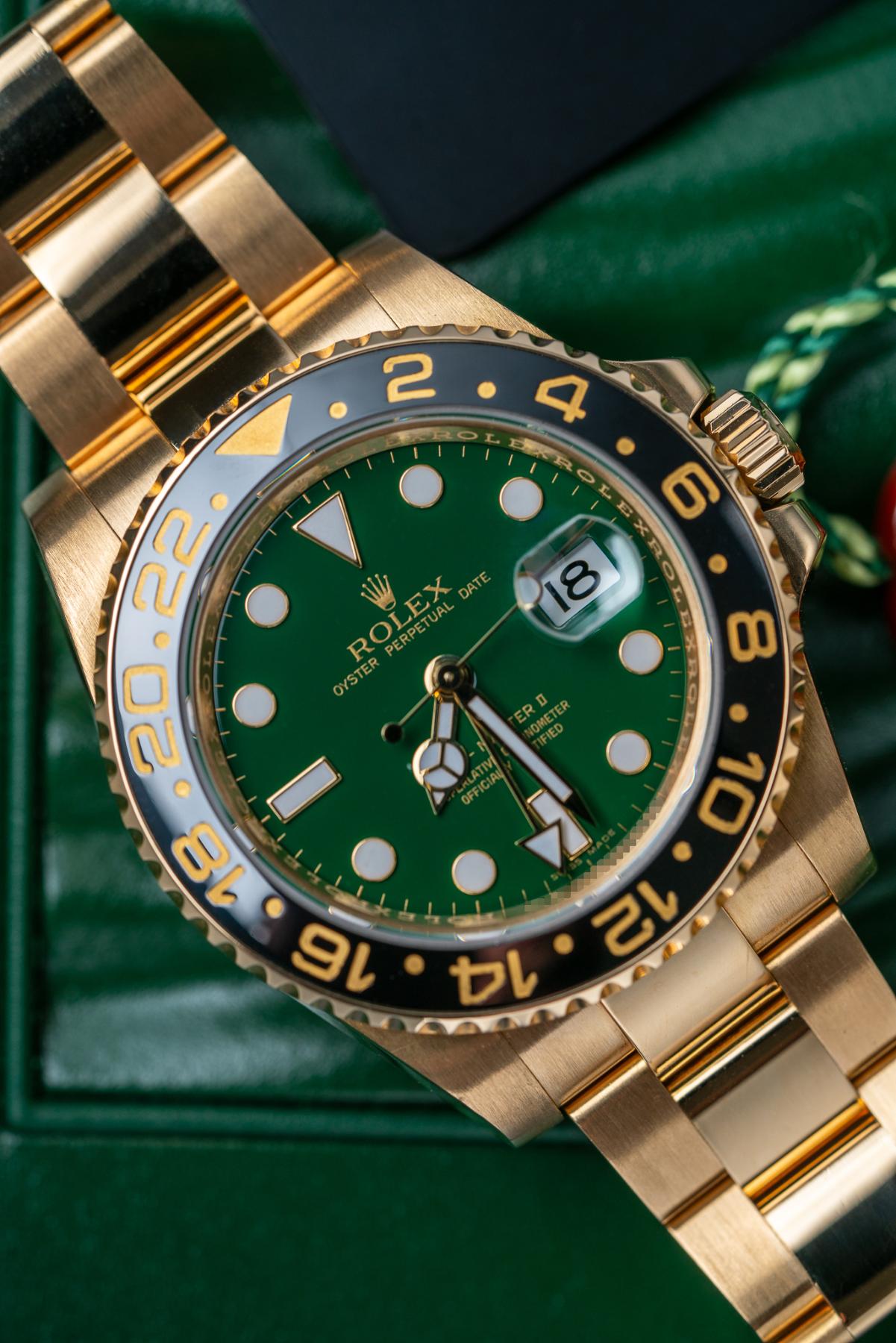 The Rolex GMT-Master II 116718LN is a statement travel watch crafted entirely in 18k yellow gold with a 40 mm case and black Cerachrom 24-hour bezel. Its signature green sunburst “anniversary” dial celebrates the GMT-Master’s 50th year and pairs luminous Maxi markers with Mercedes hands and a date under the Cyclops. Inside beats the Caliber 3186 with independent hour hand, dual-time functionality, and COSC precision. Water-resistant to 100 m, the watch is finished with a solid gold Oyster bracelet and Oysterlock clasp. The 116718LN green dial blends Rolex travel heritage, precious-metal luxury, and modern ceramic durability.
