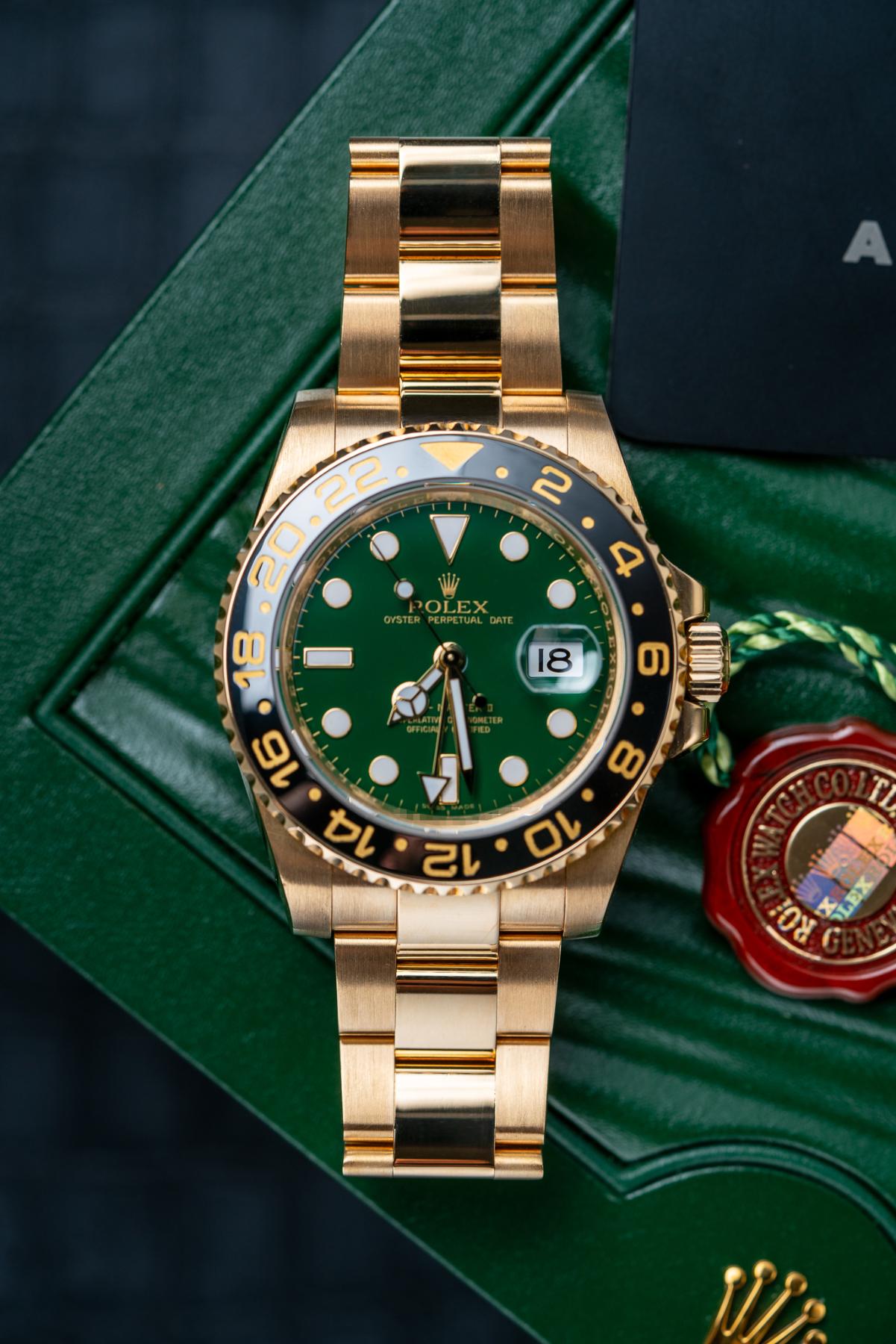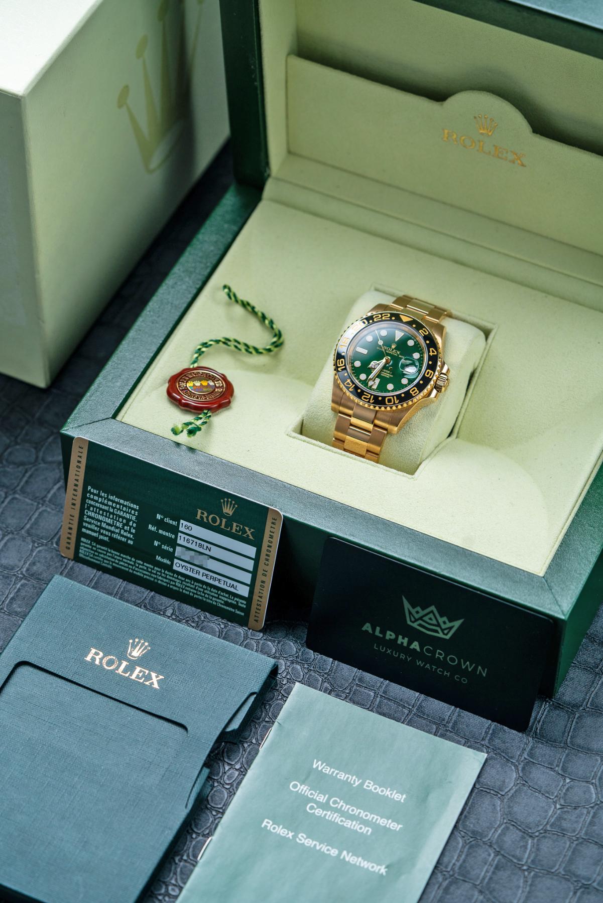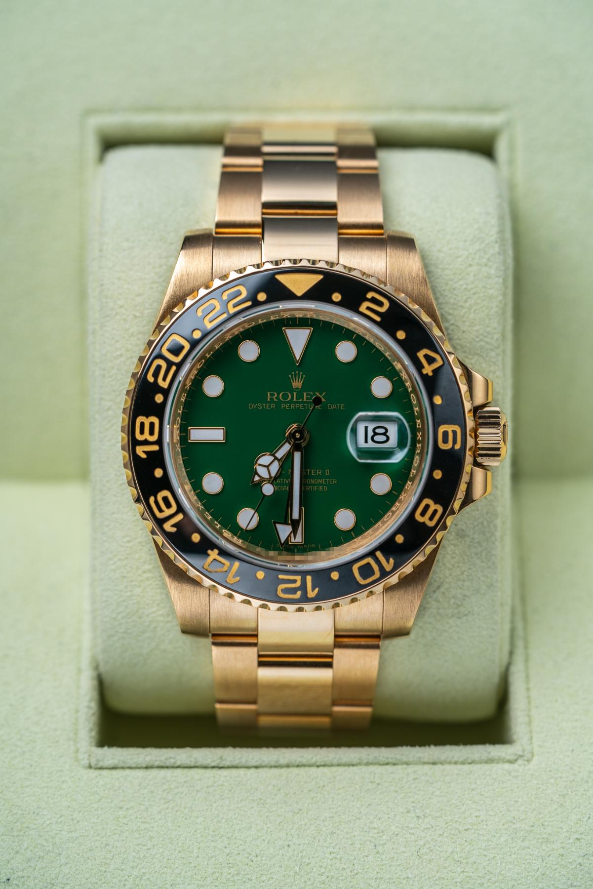 The Rolex GMT-Master II 116718LN is a statement travel watch crafted entirely in 18k yellow gold with a 40 mm case and black Cerachrom 24-hour bezel. Its signature green sunburst “anniversary” dial celebrates the GMT-Master’s 50th year and pairs luminous Maxi markers with Mercedes hands and a date under the Cyclops. Inside beats the Caliber 3186 with independent hour hand, dual-time functionality, and COSC precision. Water-resistant to 100 m, the watch is finished with a solid gold Oyster bracelet and Oysterlock clasp. The 116718LN green dial blends Rolex travel heritage, precious-metal luxury, and modern ceramic durability.