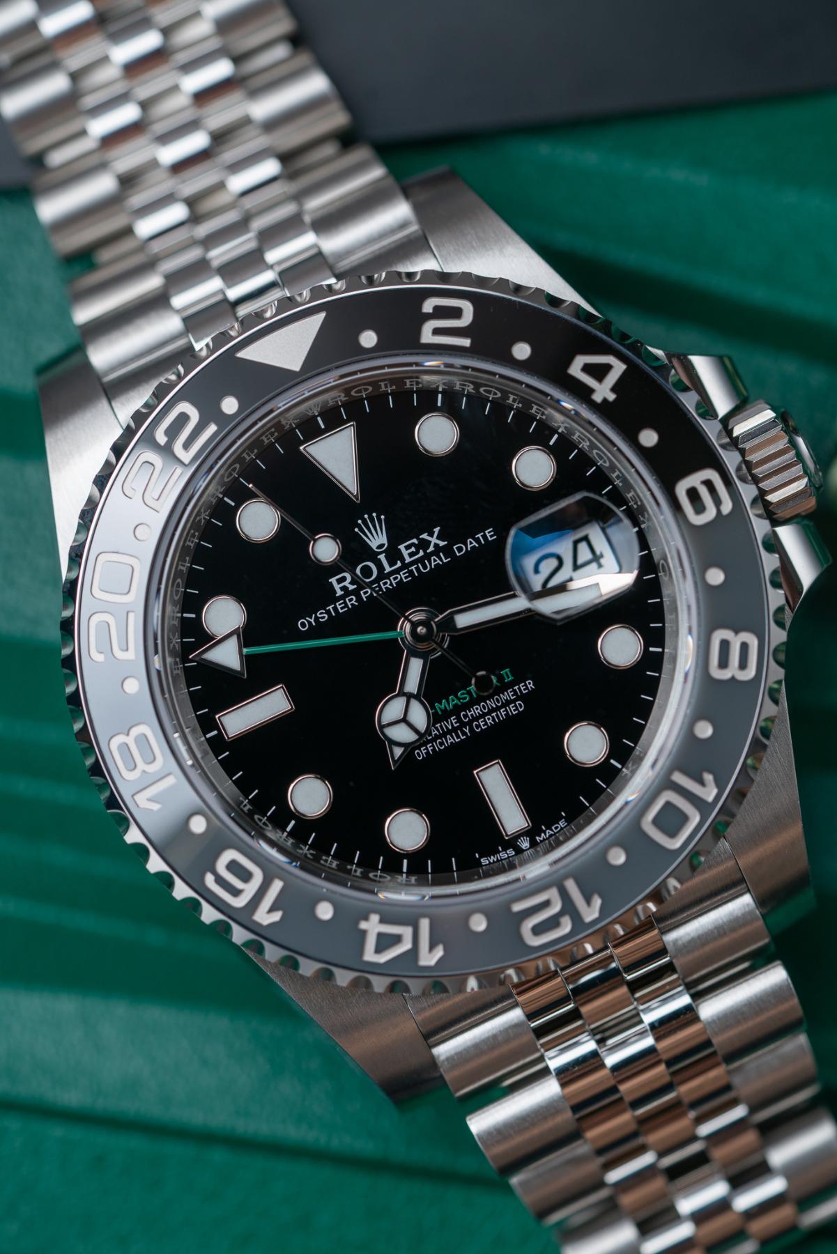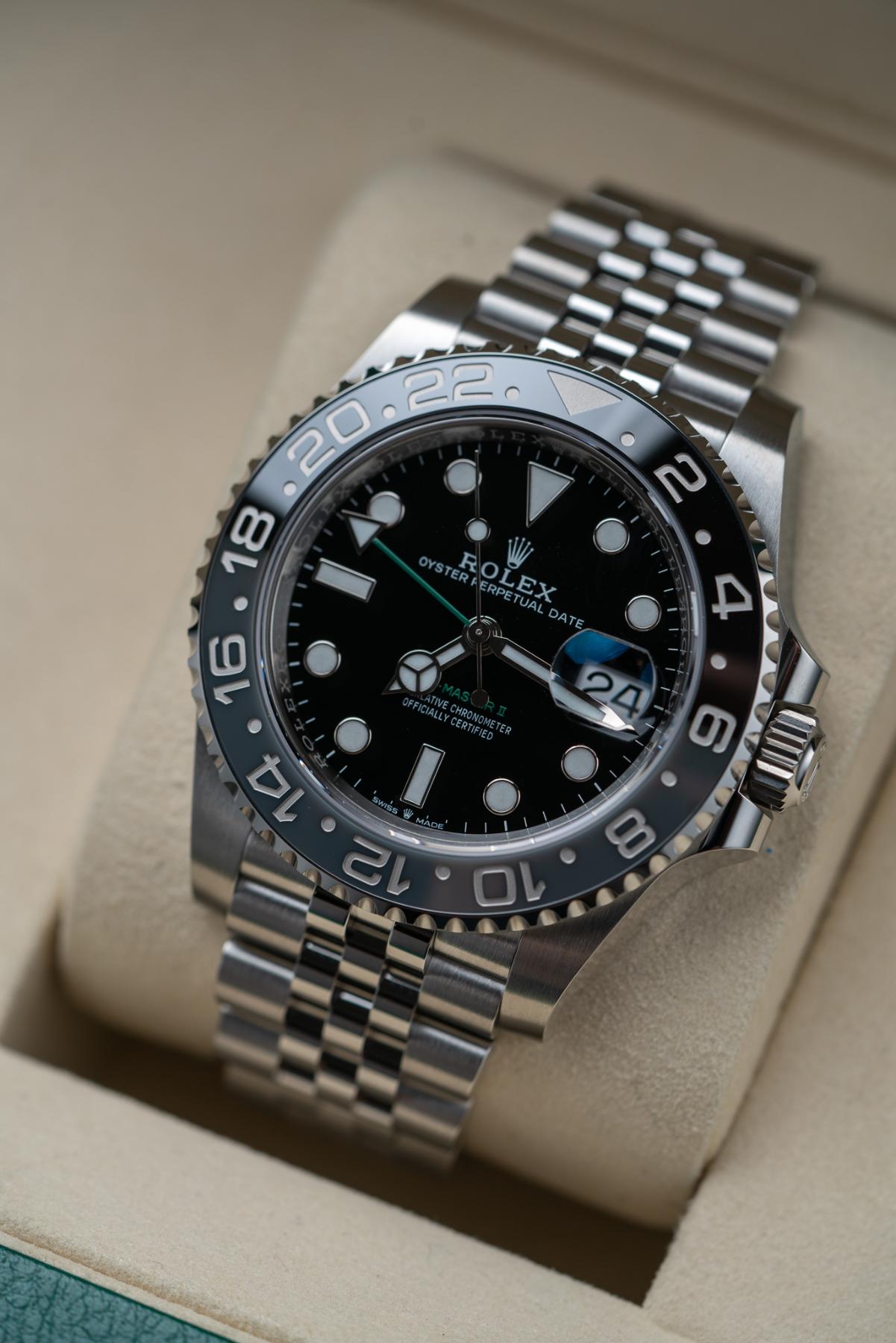 The Rolex GMT-Master II 126710GRNR is a sleek travel watch featuring a distinctive gray and black Cerachrom ceramic bezel—a first in the GMT lineup. Crafted from Oystersteel, this 40mm model offers a sporty yet refined look with your choice of Oyster or Jubilee bracelet. The black dial includes a green GMT hand and date display under a Cyclops lens for optimal functionality. Powered by the automatic Caliber 3285, it delivers a 70-hour power reserve, dual time zone capability, and Superlative Chronometer precision. The 126710GRNR is the perfect Rolex for travelers seeking modern design with iconic GMT heritage.