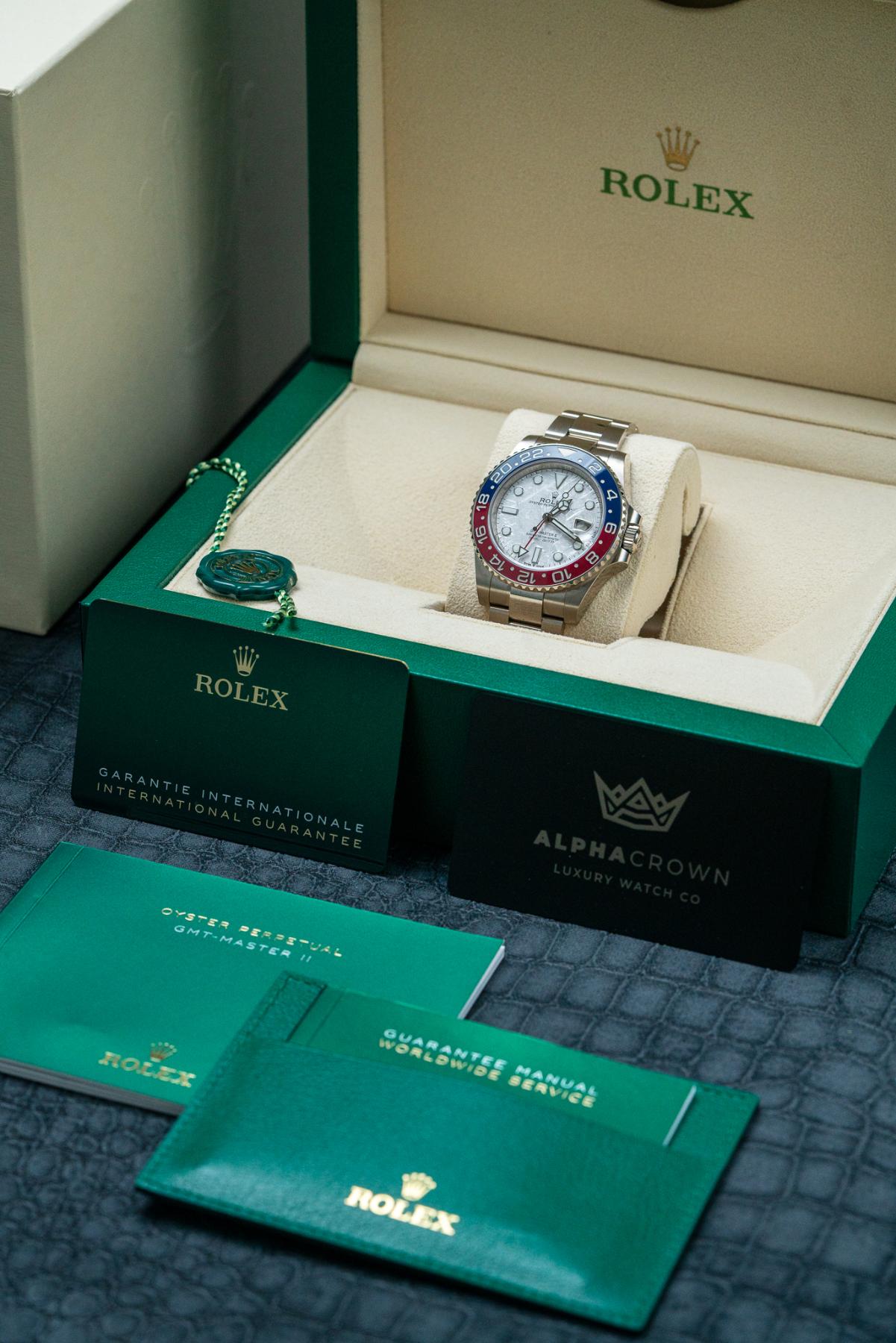 The Rolex GMT-Master II 126719BLRO is a luxurious take on the iconic “Pepsi” GMT, crafted from solid 18k white gold. Featuring a 40mm case, a red and blue Cerachrom ceramic bezel, and a mesmerizing meteorite dial, this timepiece combines prestige with travel-ready functionality. The Caliber 3285 automatic movement powers dual time zone tracking, a date display with a Cyclops lens, and a 70-hour power reserve. Fitted with an Oyster bracelet and water-resistant to 100 meters, the 126719BLRO is the perfect blend of Rolex heritage, cutting-edge technology, and exclusive materials—ideal for collectors seeking a premium GMT experience.