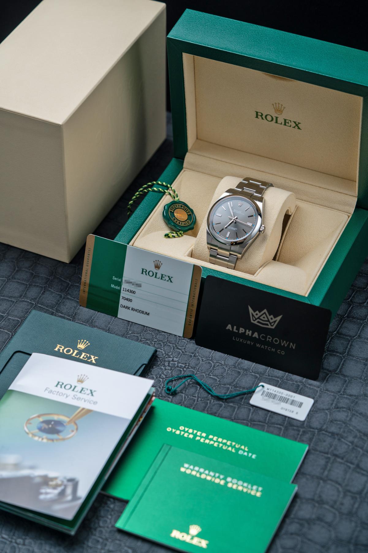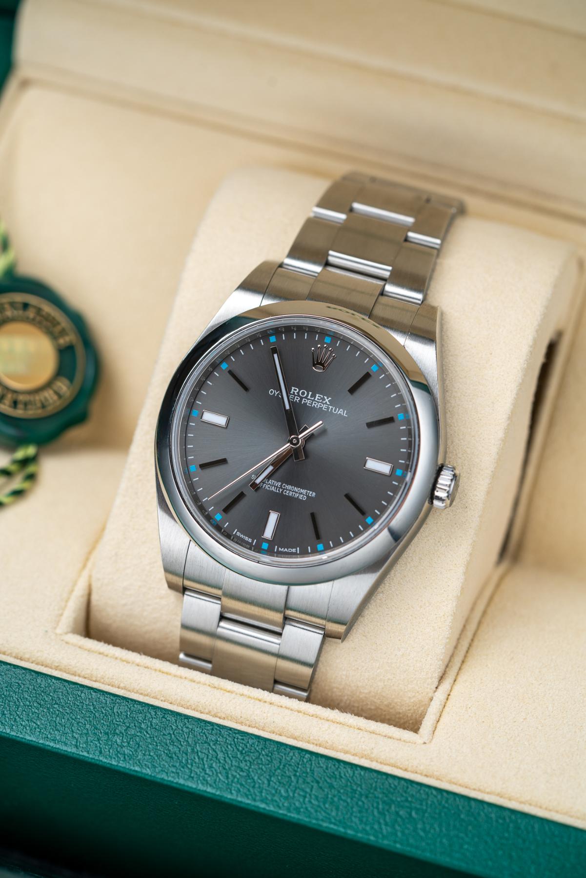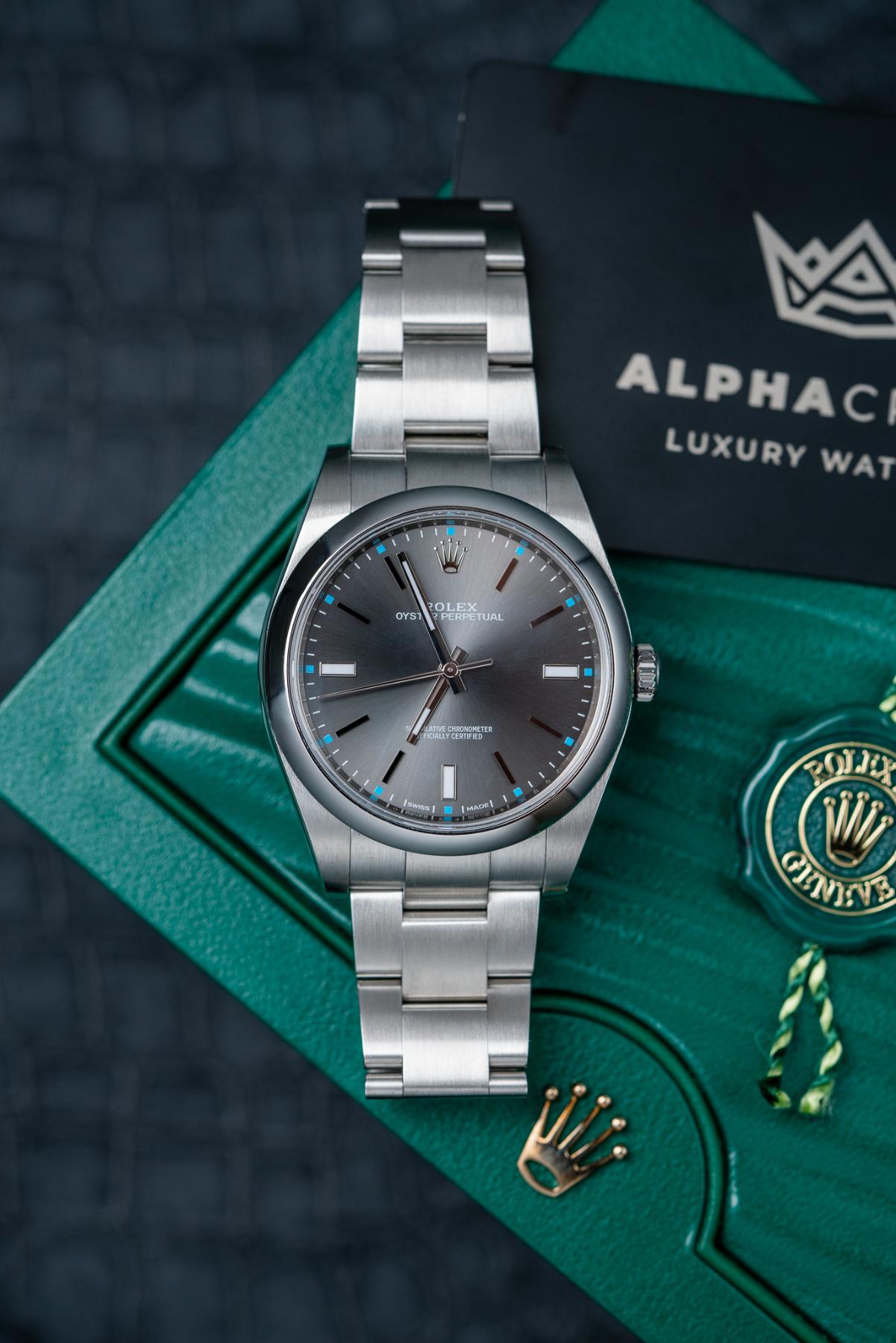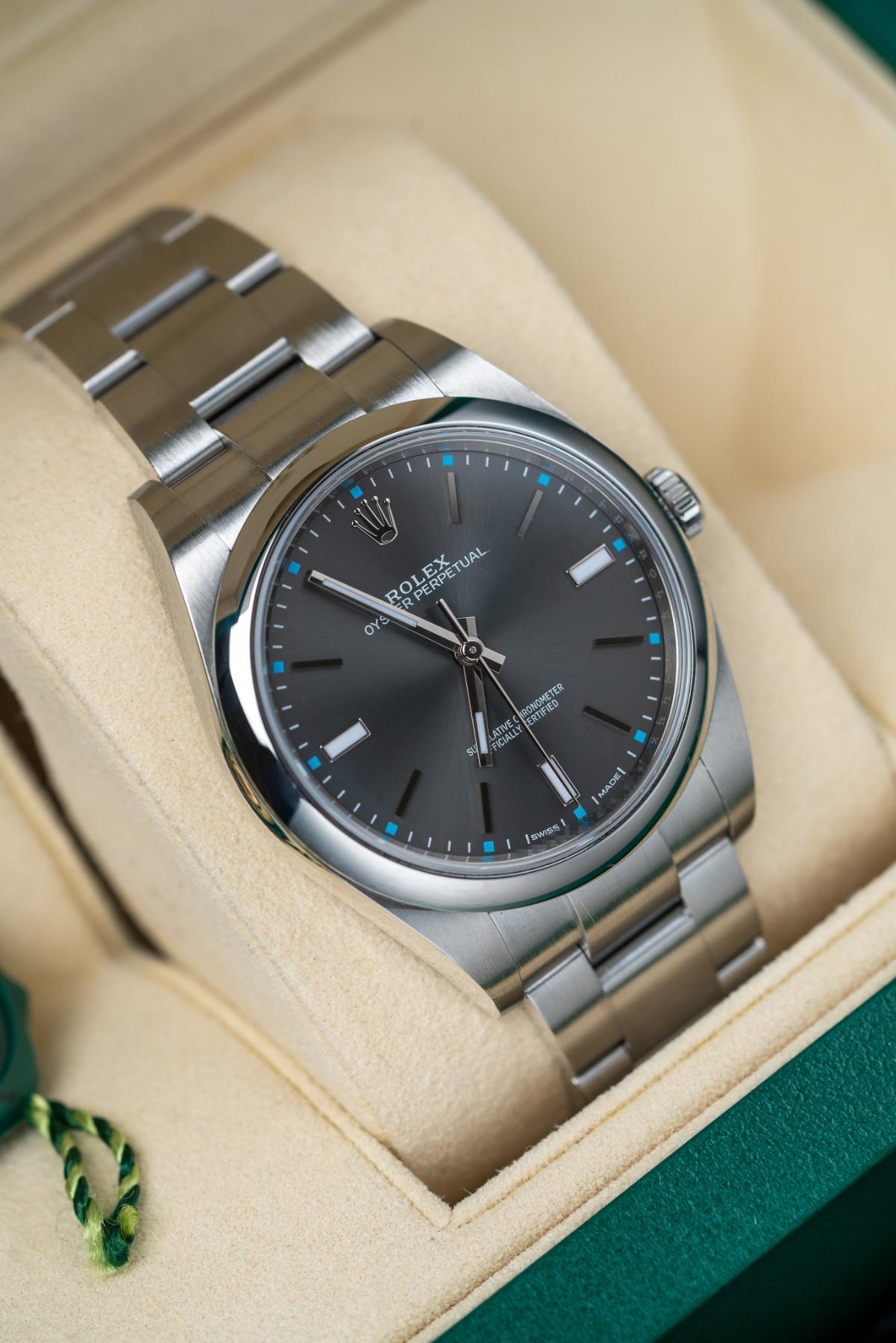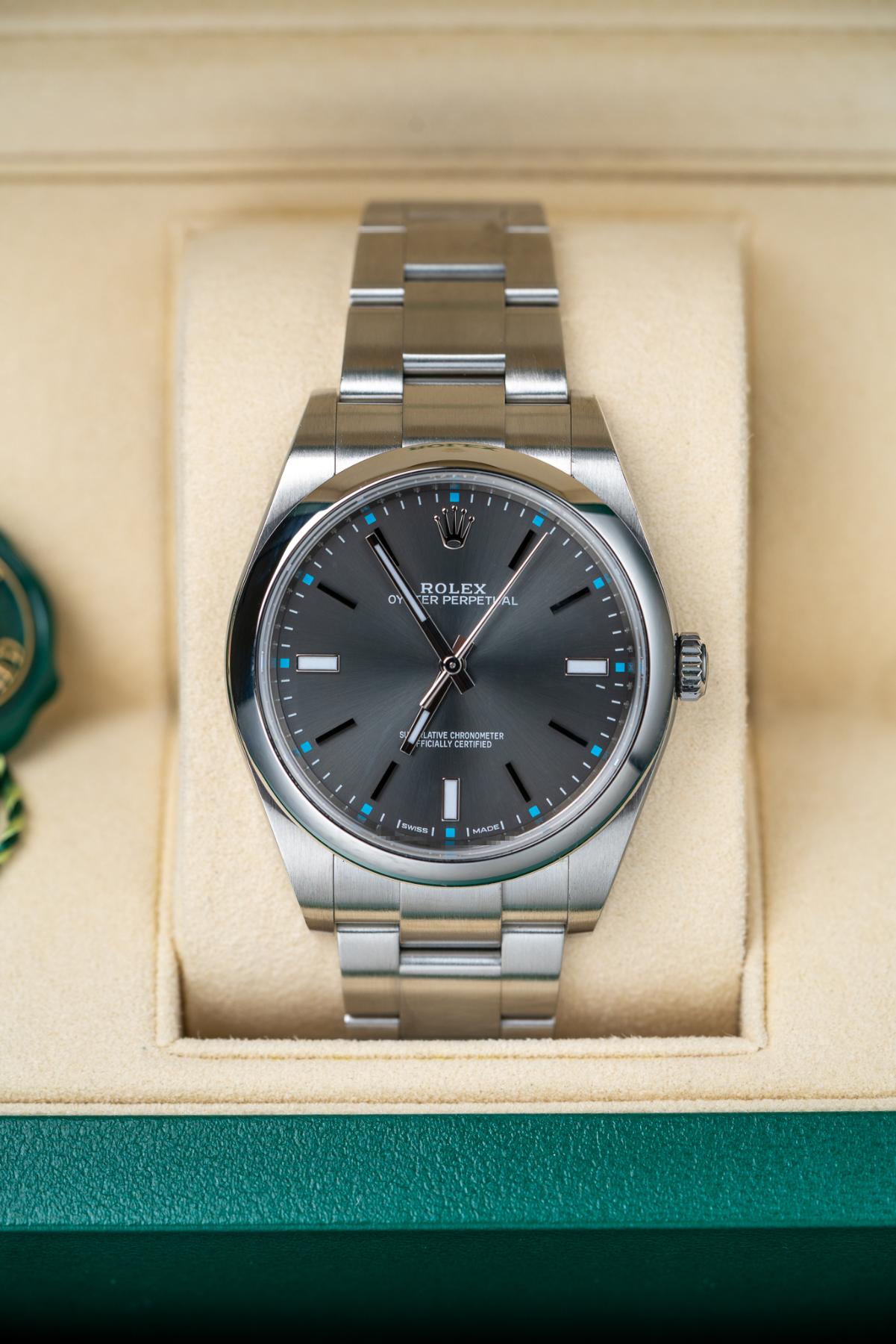 The Rolex Oyster Perpetual 39 Ref. 114300 in Dark Rhodium is a sleek, versatile timepiece blending everyday durability with refined styling. Crafted from corrosion-resistant stainless steel, it boasts a 39 mm case with a smooth domed bezel, Oyster bracelet, and sapphire crystal. The dark rhodium sunburst dial exhibits elegant grey tones, edged with applied index hour markers and luminescent hands for superb legibility — set within Rolex’s calibre 3132 automatic movement, delivering ~48 hours of power reserve with Parachrom hairspring and Paraflex shock absorbers. The 114300 Dark Rhodium is a standout for those seeking Rolex heritage in a clean, modern package.