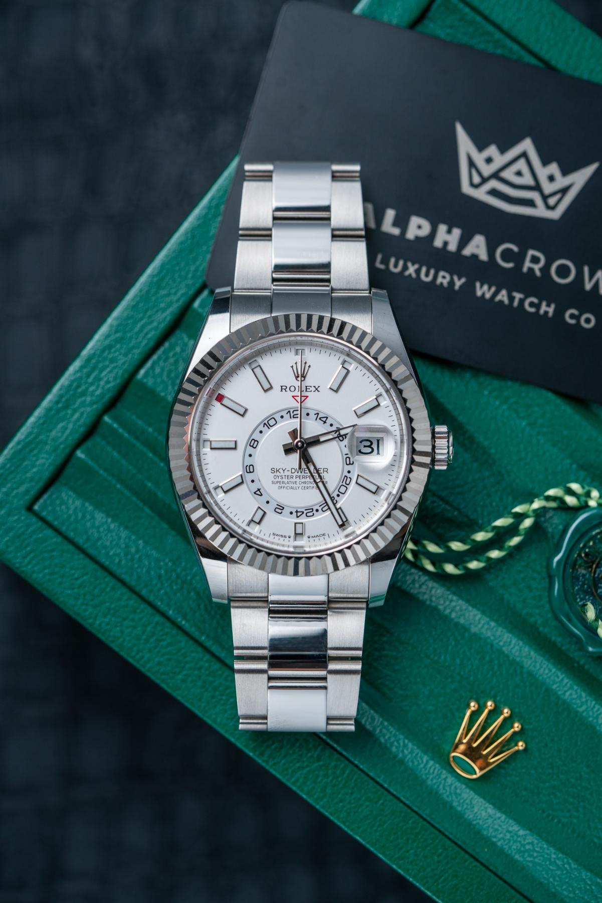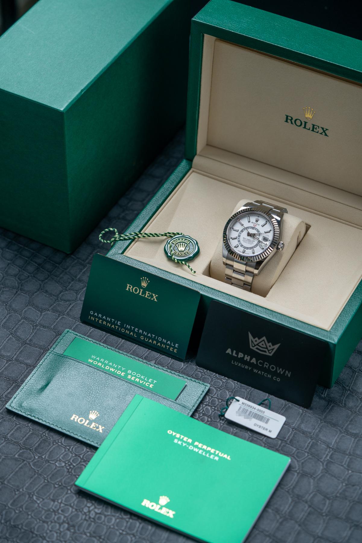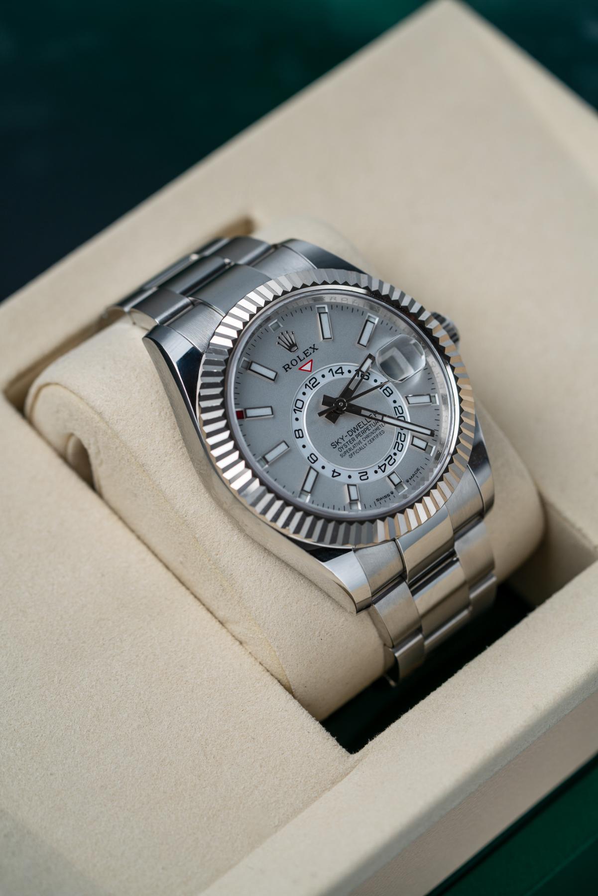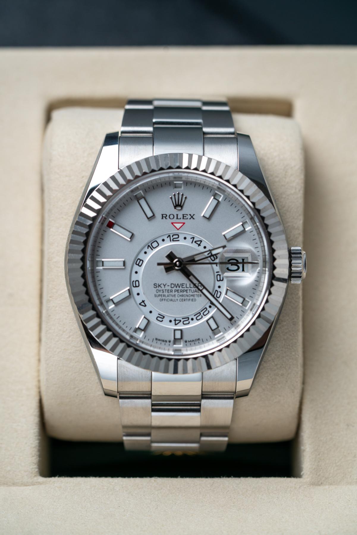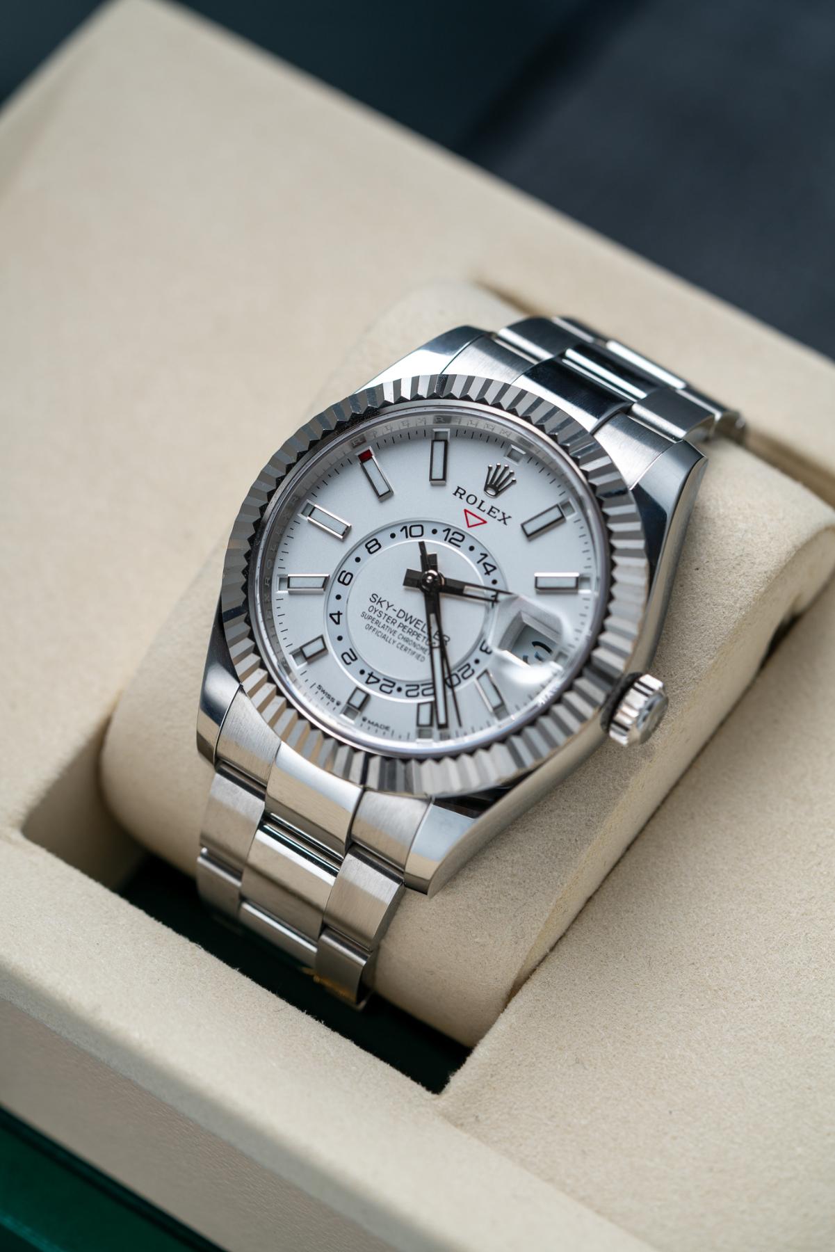 The Rolex Sky-Dweller Ref. 336934 blends sophisticated functionality with modern elegance. Crafted in Oystersteel with an 18k white gold fluted bezel and a 42 mm case, this model features a striking sunburst dial and the distinctive off-centre 24-hour disc for dual time-zone tracking. The innovative annual calendar displays the current month through apertures around the dial and adjusts the date automatically—requiring only one correction per year . Equipped with the Ring Command bezel system and powered by the Calibre 9002 self-winding movement, the 336934 stands out as a premium travel companion. Water-resistant to 100m and fitted with the Oyster bracelet, it’s an ideal choice for collectors seeking advanced horology wrapped in classic Rolex design.
