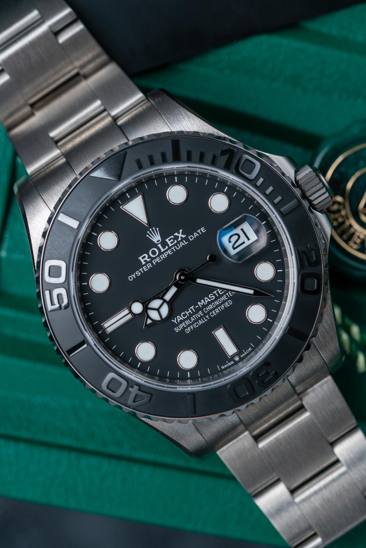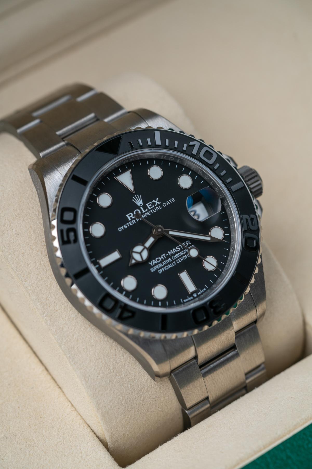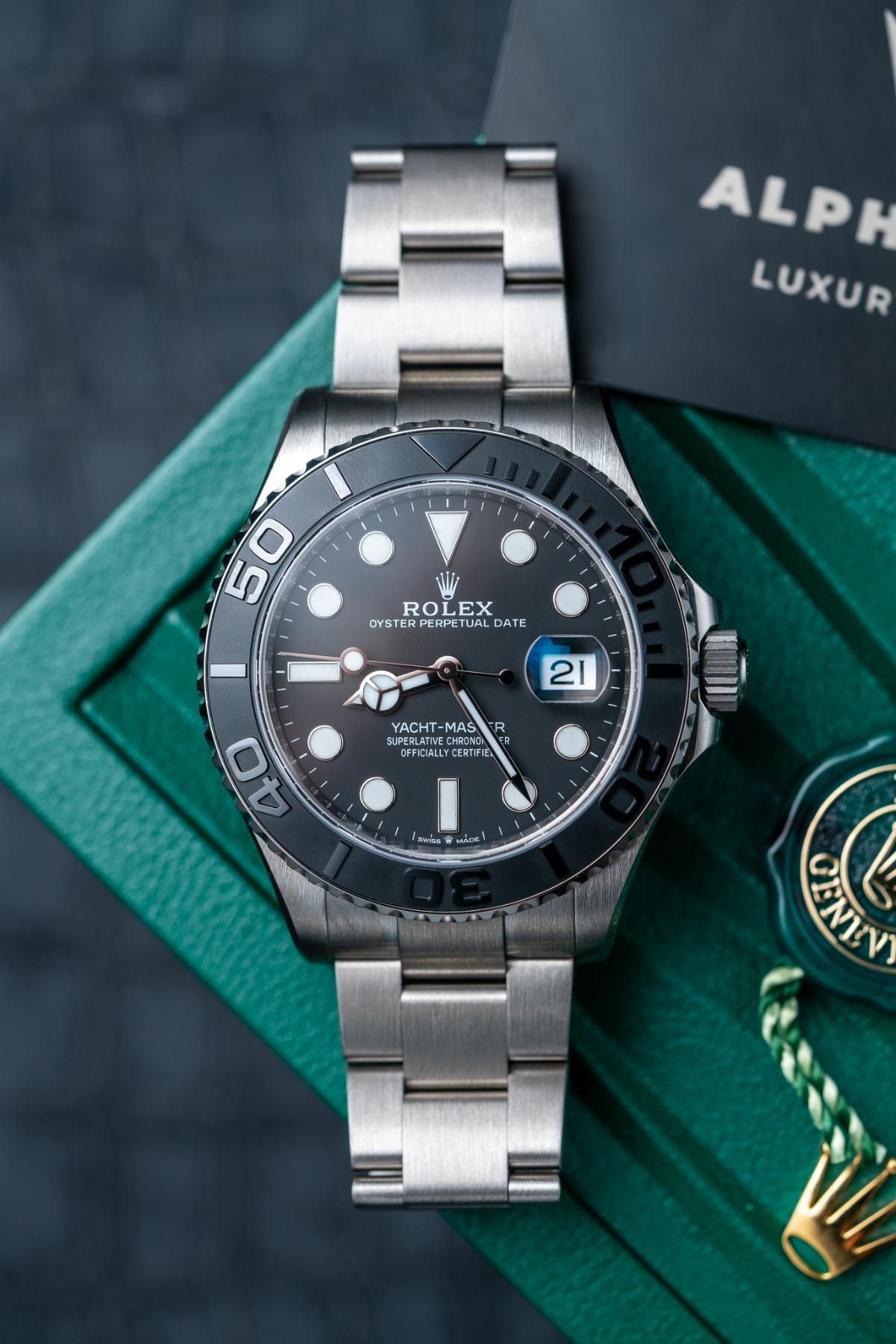 The Rolex Yacht-Master 42 Ref. 226627 is the first Yacht-Master crafted in RLX titanium, a lightweight yet durable alloy exclusive to Rolex. Its 42mm case pairs with a bidirectional rotatable bezel featuring a black Cerachrom insert and raised numerals for bold contrast. The black dial with Chromalight luminescence ensures legibility in any light, while the Oyster bracelet with Oysterlock clasp offers comfort and security. Powered by the Caliber 3235, it delivers a 70-hour power reserve, Superlative Chronometer precision, and 100m water resistance. The 226627 combines nautical heritage with cutting-edge materials, making it the ultimate luxury sailing companion.