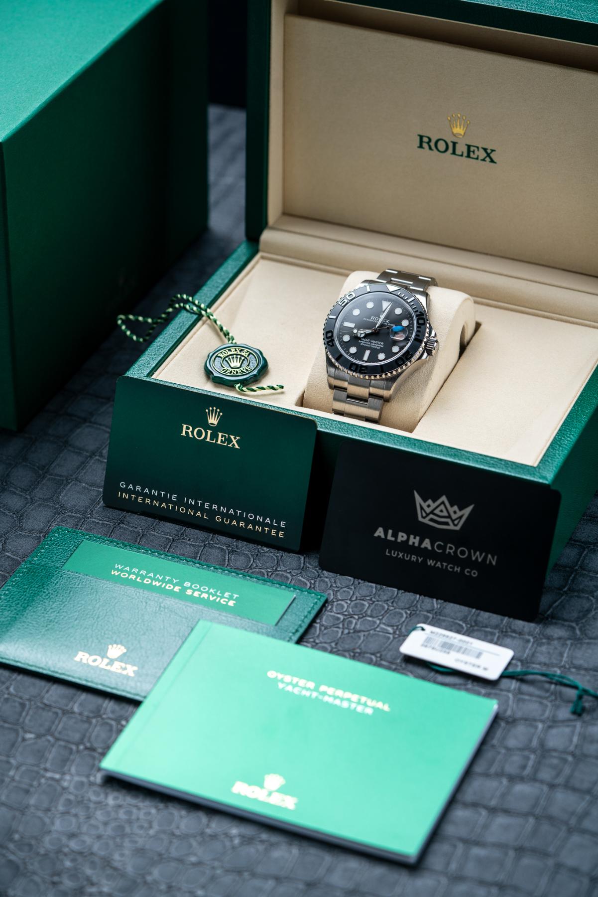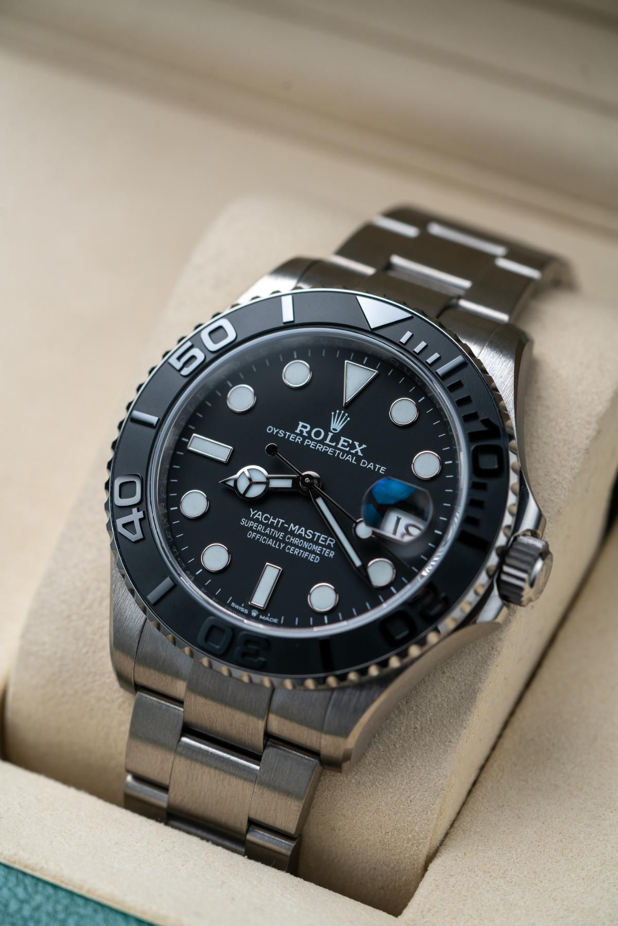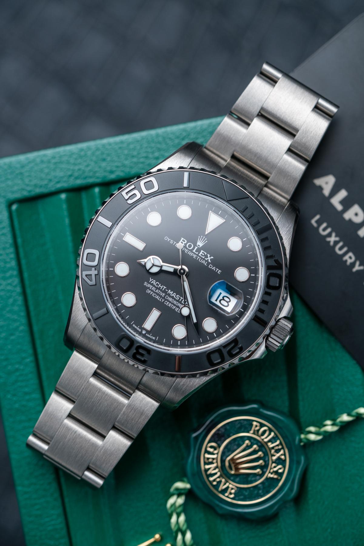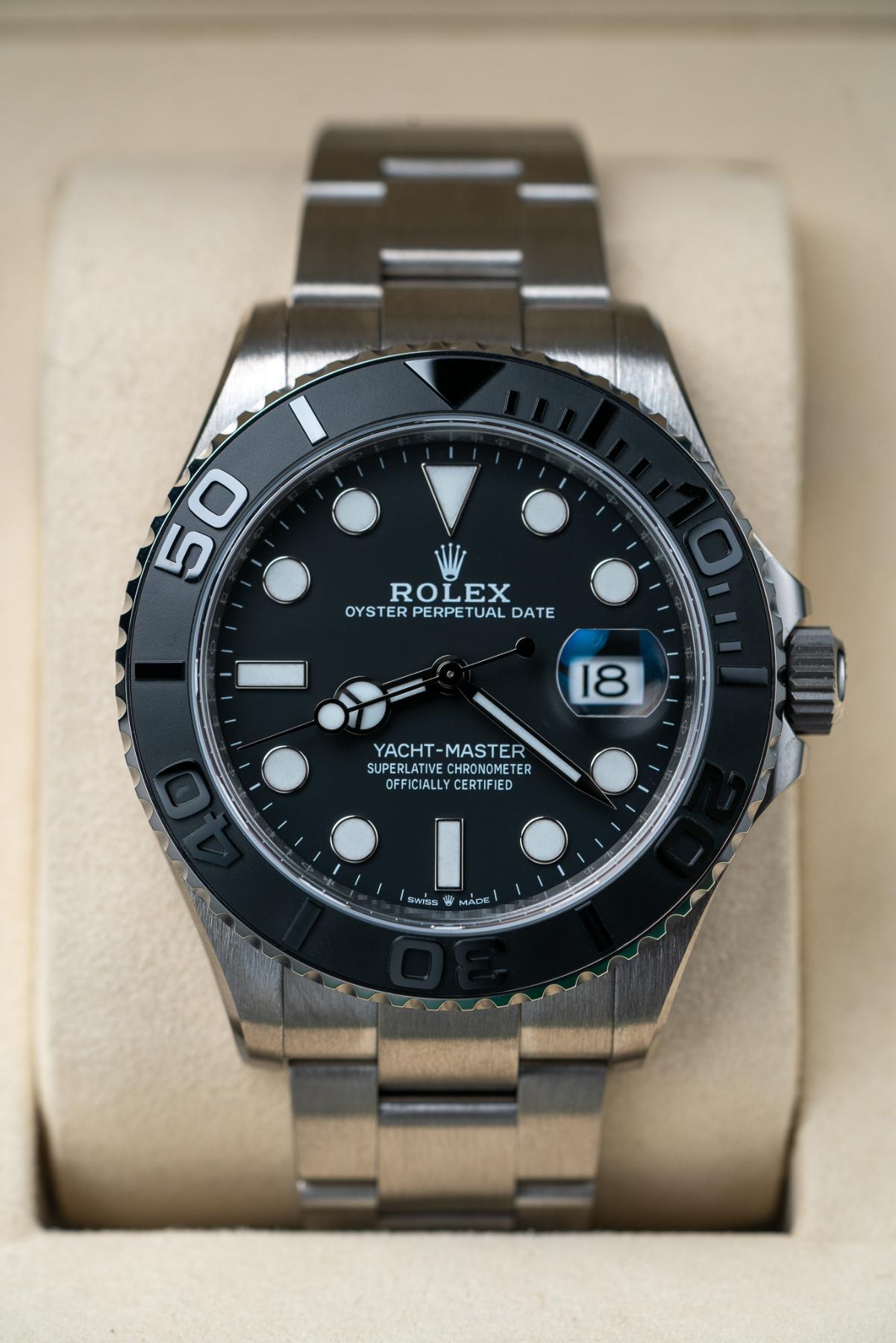 The Rolex Yacht-Master 42 Ref. 226627 is the first Yacht-Master crafted in RLX titanium, a lightweight yet durable alloy exclusive to Rolex. Its 42mm case pairs with a bidirectional rotatable bezel featuring a black Cerachrom insert and raised numerals for bold contrast. The black dial with Chromalight luminescence ensures legibility in any light, while the Oyster bracelet with Oysterlock clasp offers comfort and security. Powered by the Caliber 3235, it delivers a 70-hour power reserve, Superlative Chronometer precision, and 100m water resistance. The 226627 combines nautical heritage with cutting-edge materials, making it the ultimate luxury sailing companion.